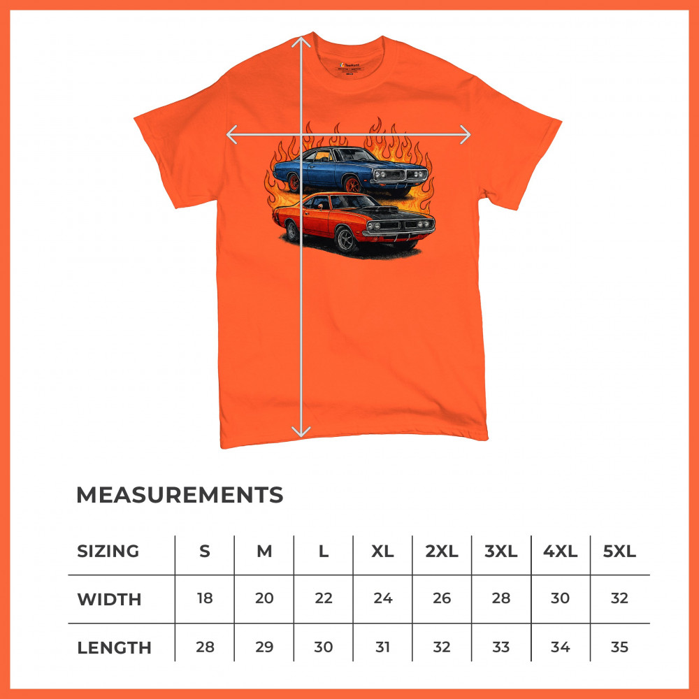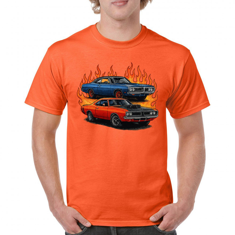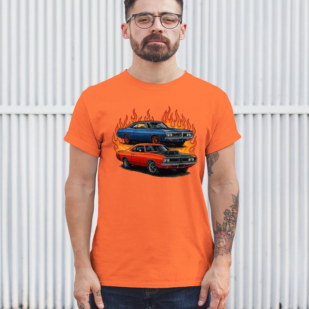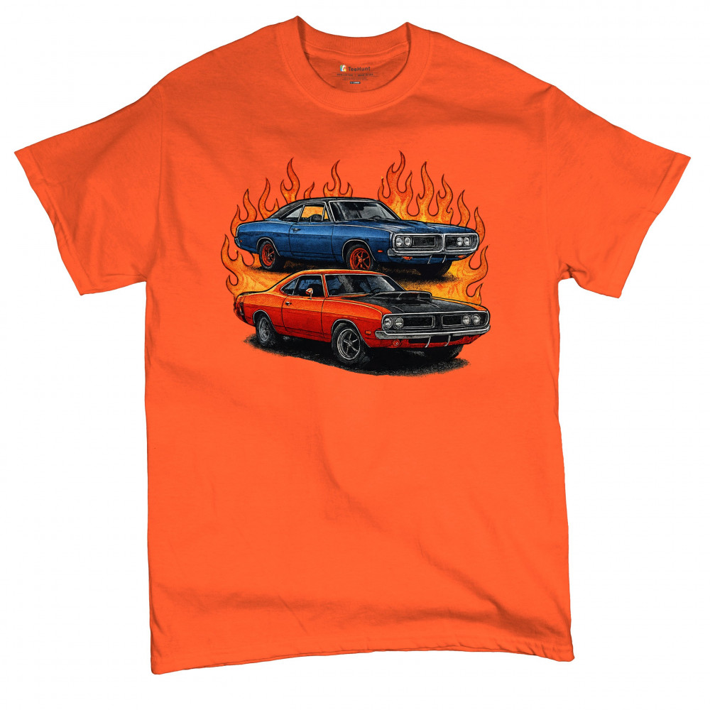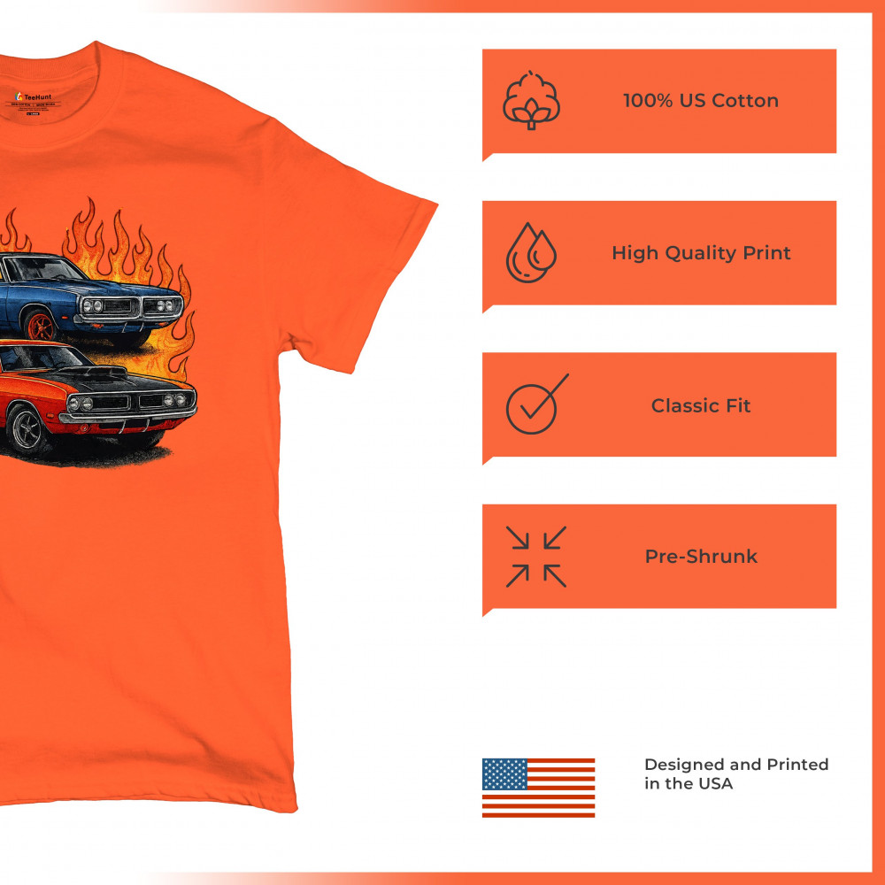 Bold flame design with classic muscle cars for gearheads and vintage horsepower lovers. Perfect for shows, cruise meets, and burnout nights.