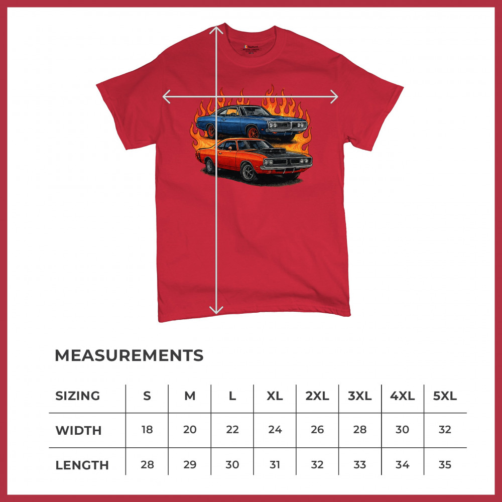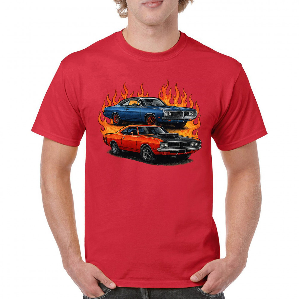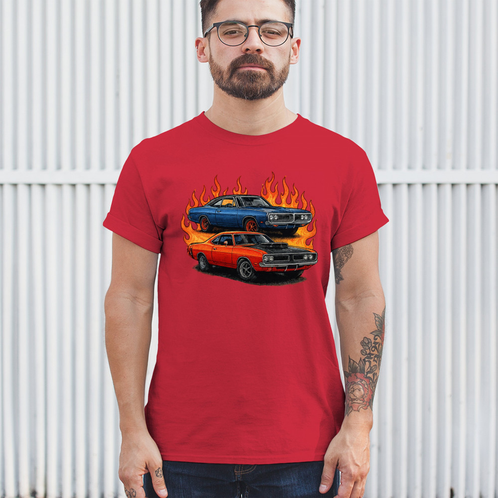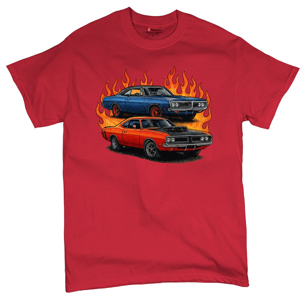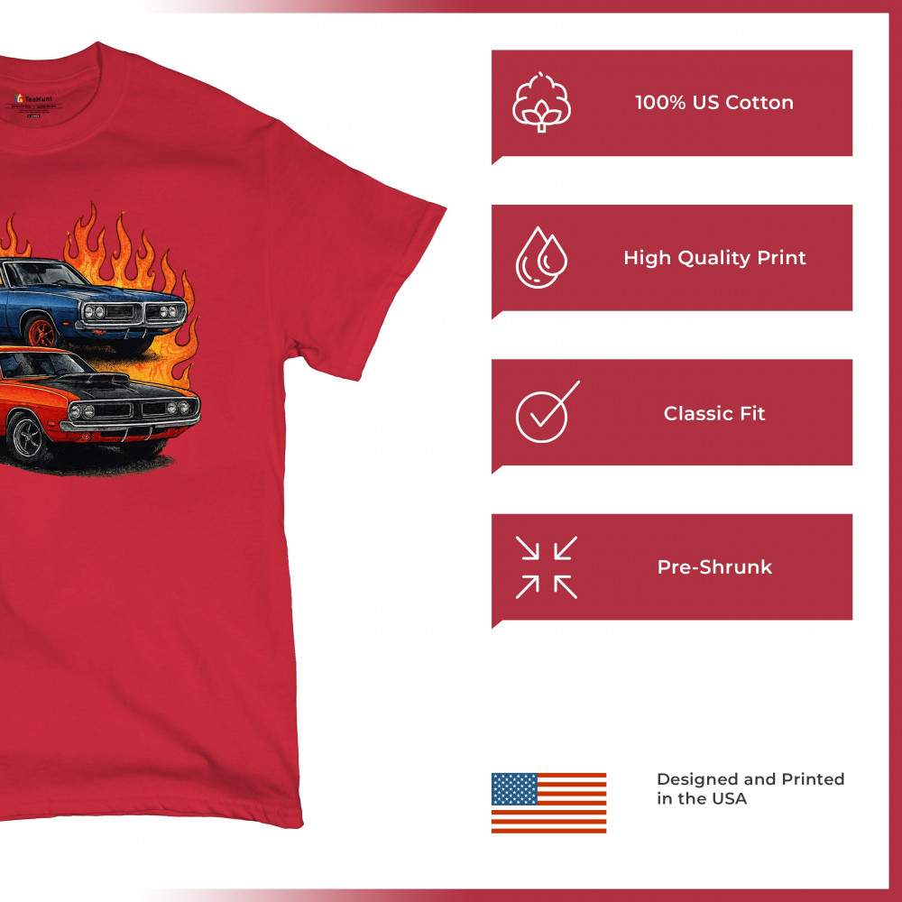 Bold flame design with classic muscle cars for gearheads and vintage horsepower lovers. Perfect for shows, cruise meets, and burnout nights.