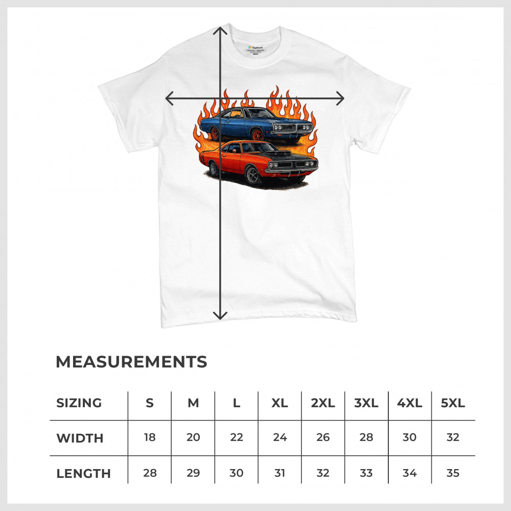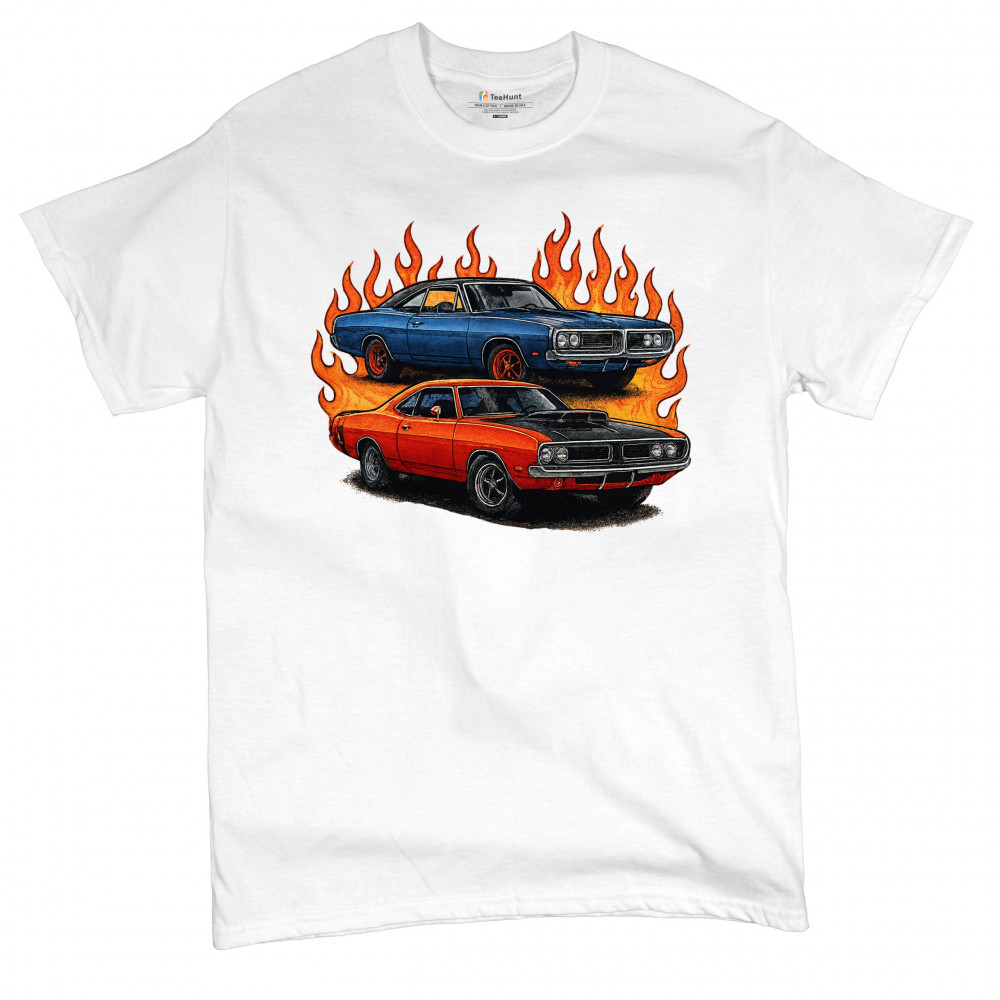 Bold flame design with classic muscle cars for gearheads and vintage horsepower lovers. Perfect for shows, cruise meets, and burnout nights.