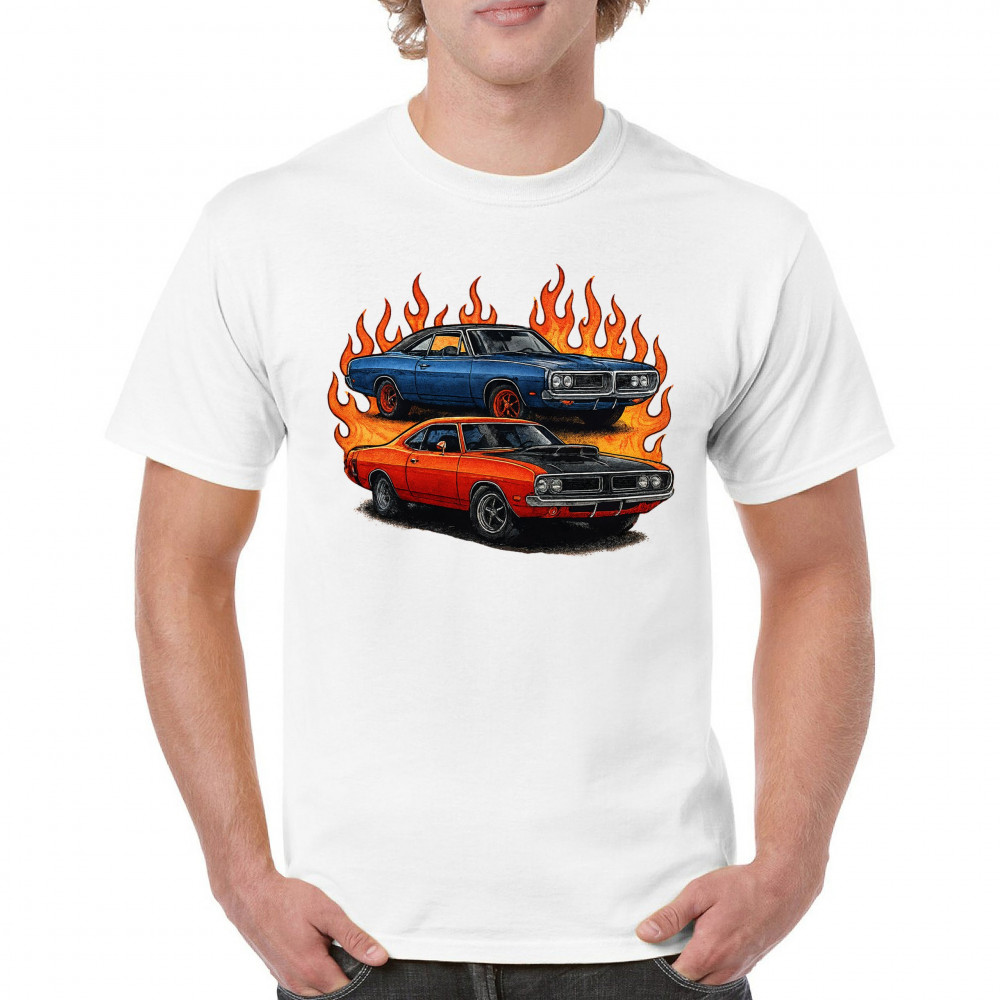This flame-wrapped design showcases two classic muscle cars set ablaze with attitude, style, and vintage horsepower. Made for adrenaline seekers, rev heads, and car lovers who thrive on raw speed and retro fire. Whether at a burnout meet or a car show, this design lets your muscle car pride burn bright.