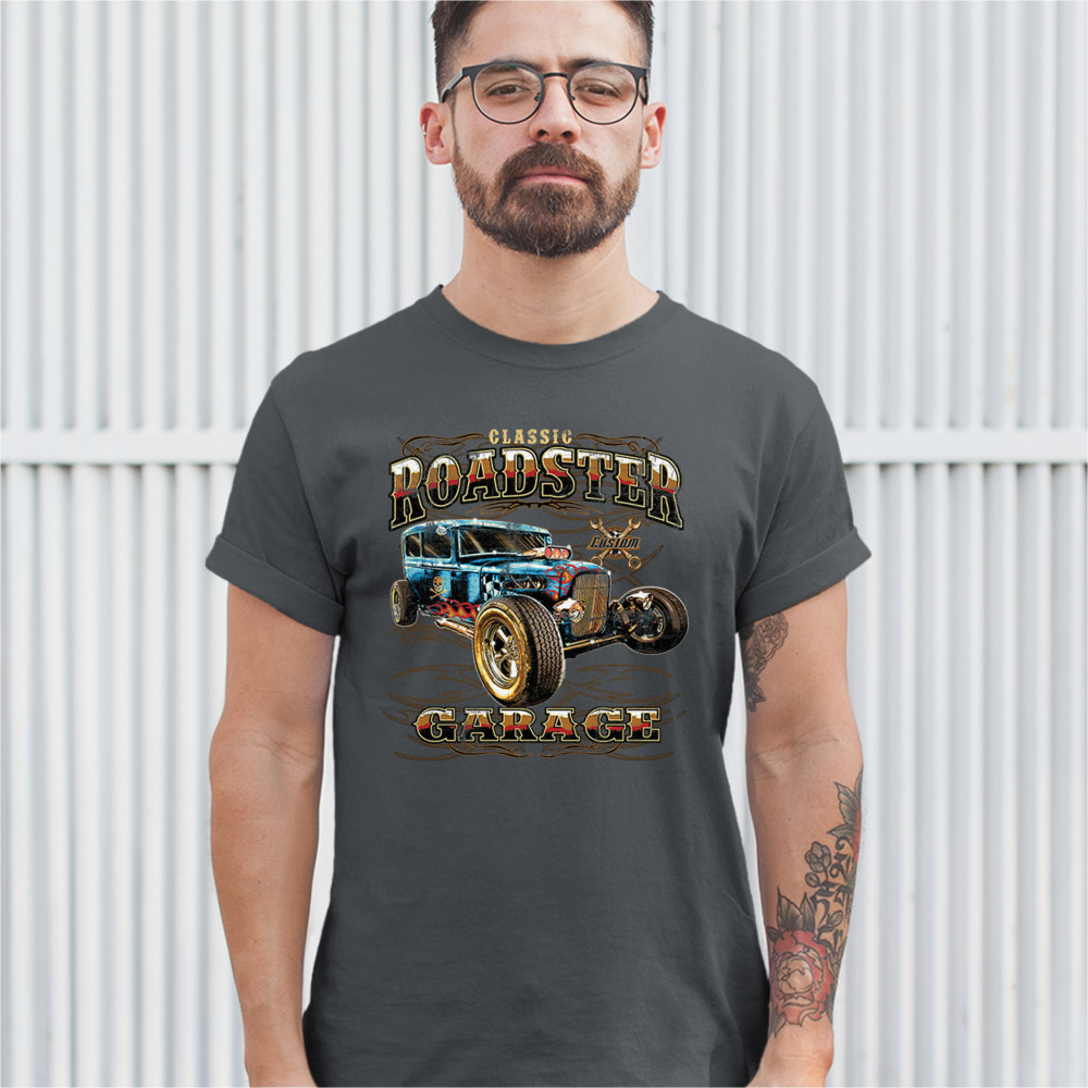 A print featuring a vintage-looking rat rod with flames and a skull with crossbones painted on it's side. "Classic Roadster" is written in the top and "Garage" in the bottom of the print. In the background there is a sign with crossed wrenches which says "custom". Great for Route 66 and hot rod fans.