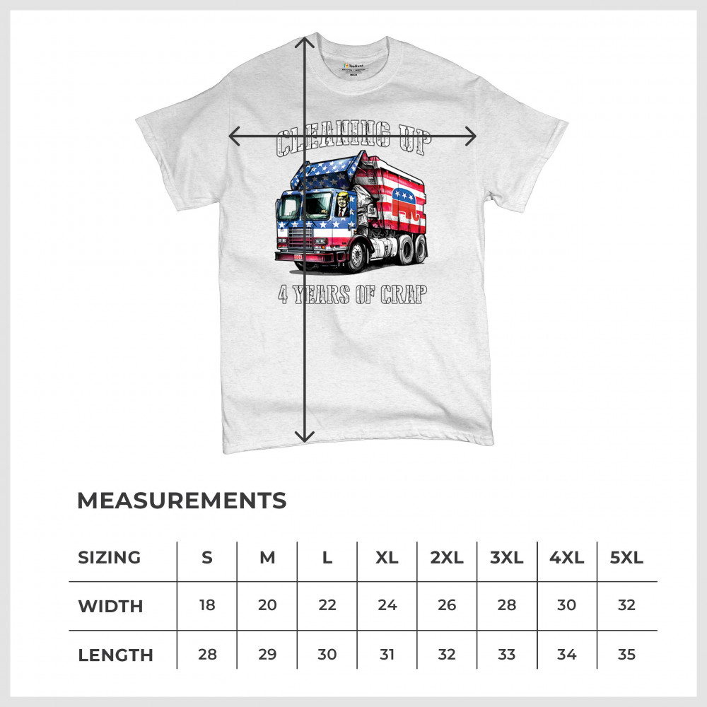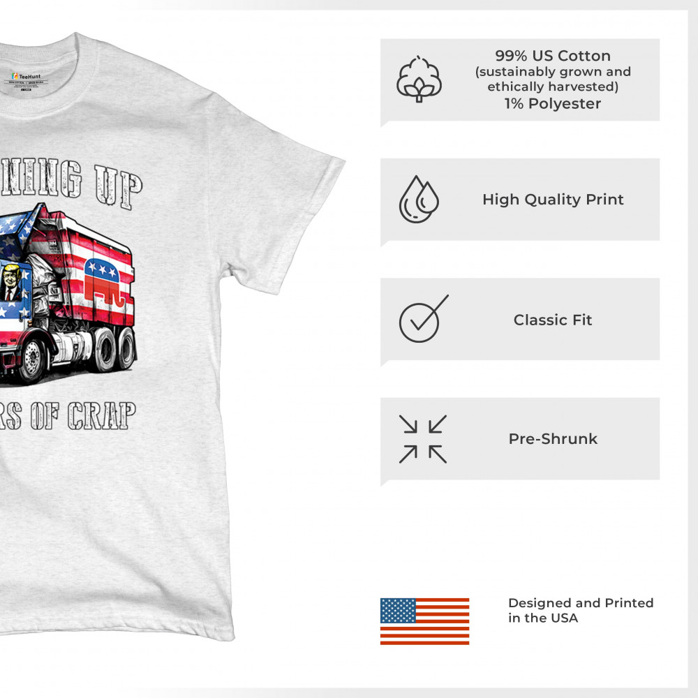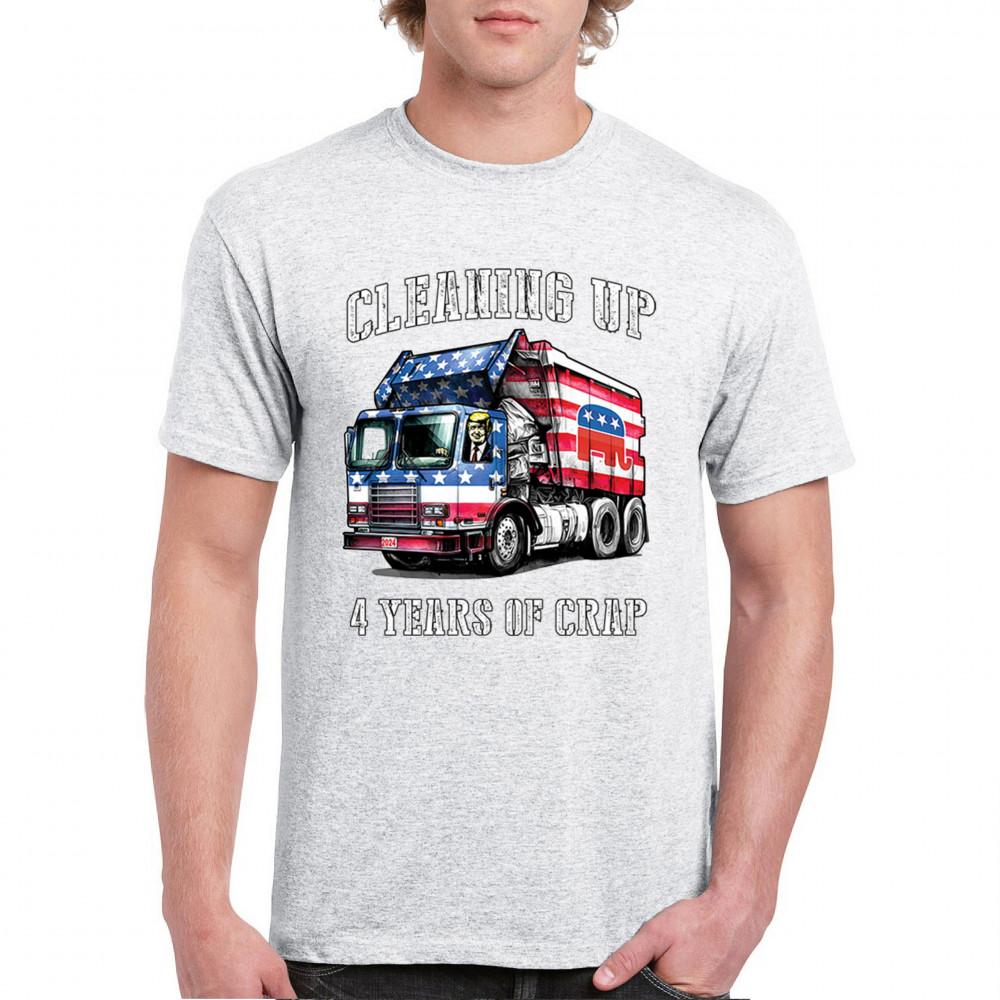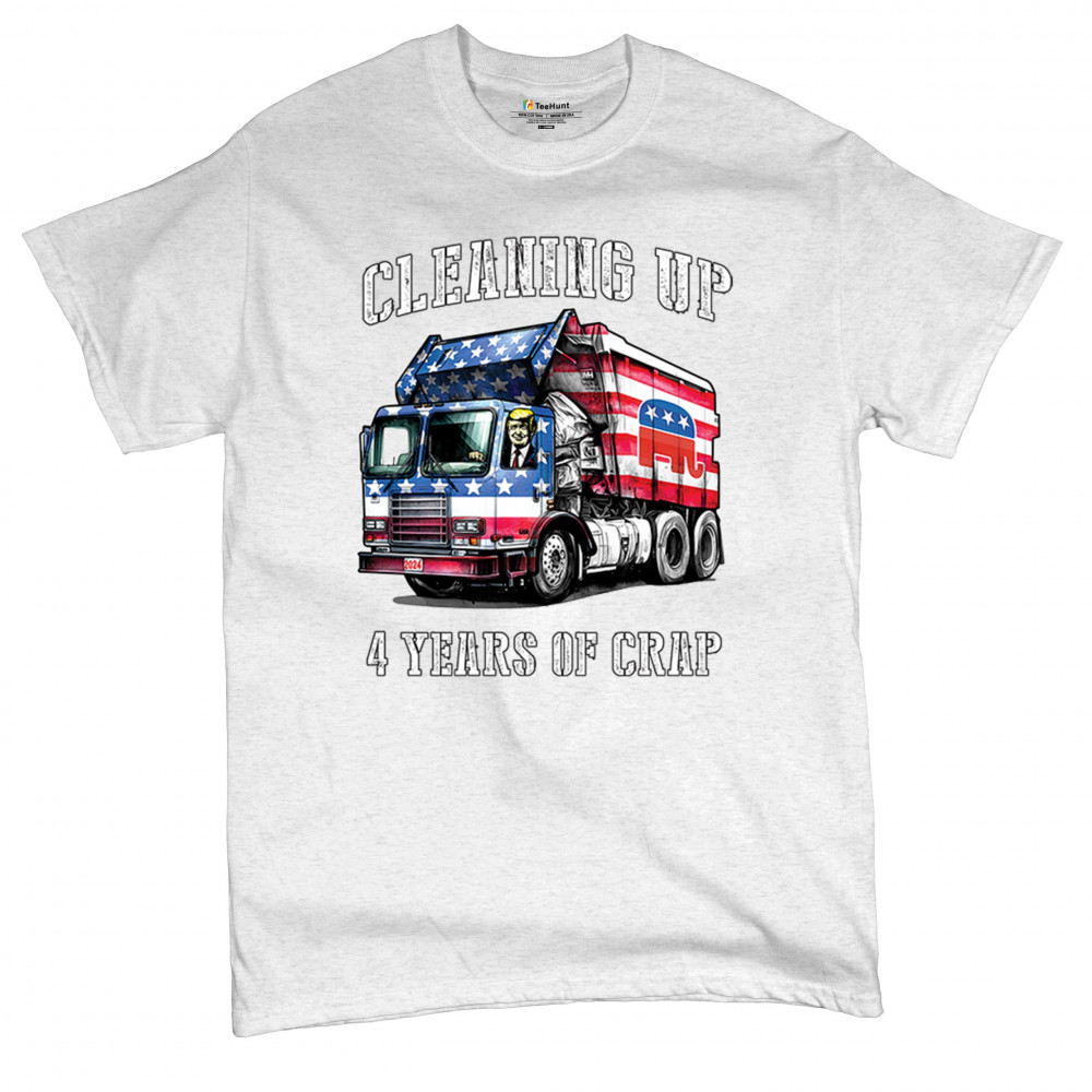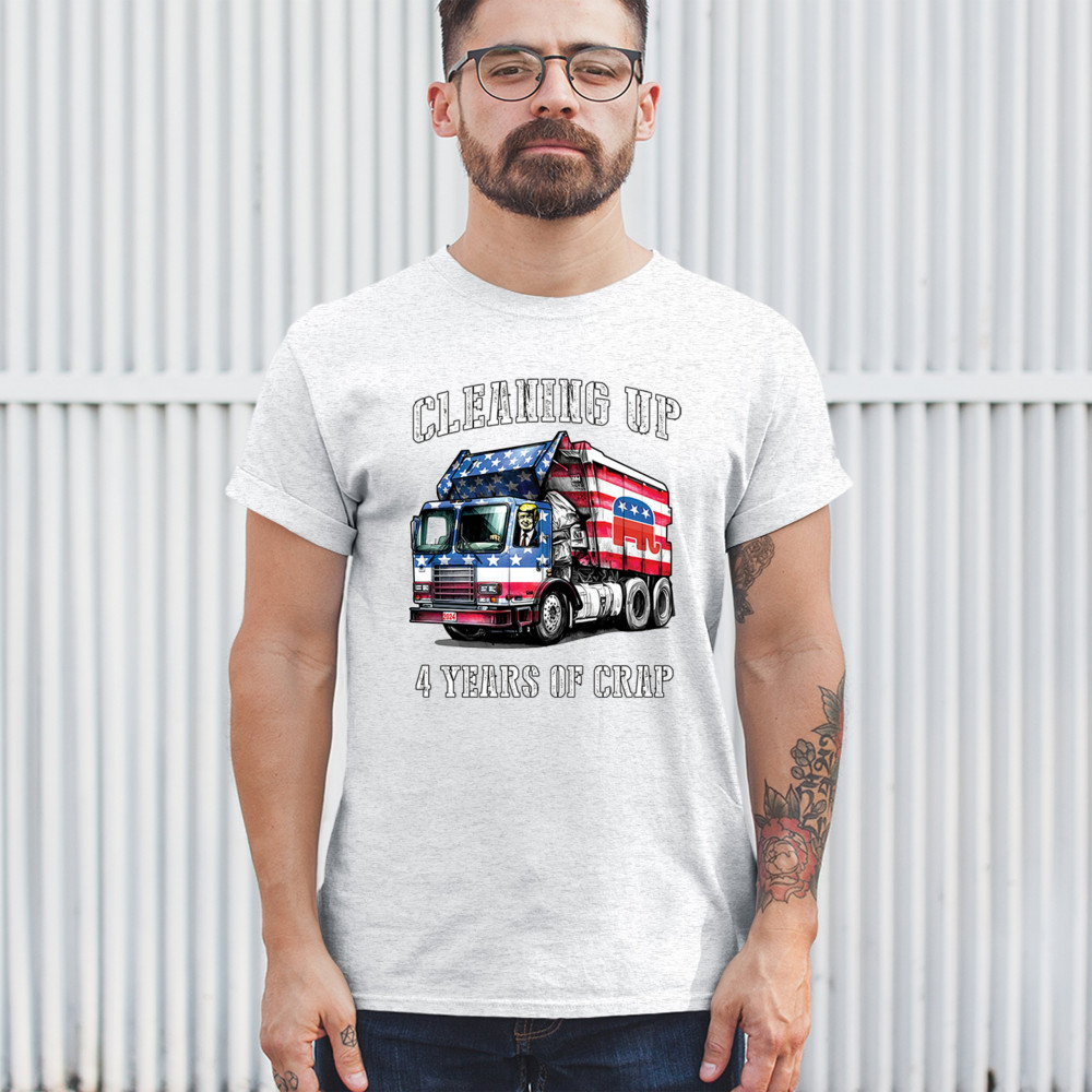 Bold "Cleaning Up 4 Years of Crap" design featuring Trump, the GOP, and the American flag. Perfect for proud conservatives and patriots.