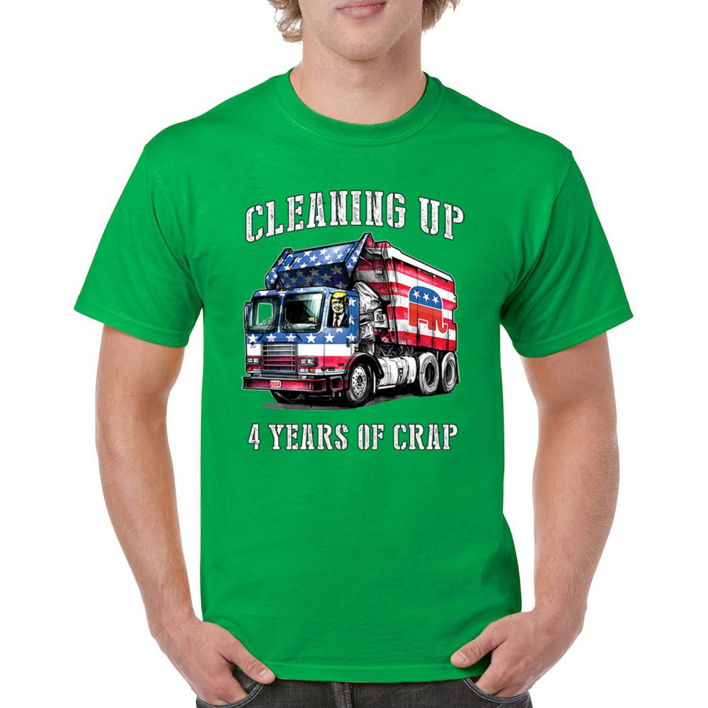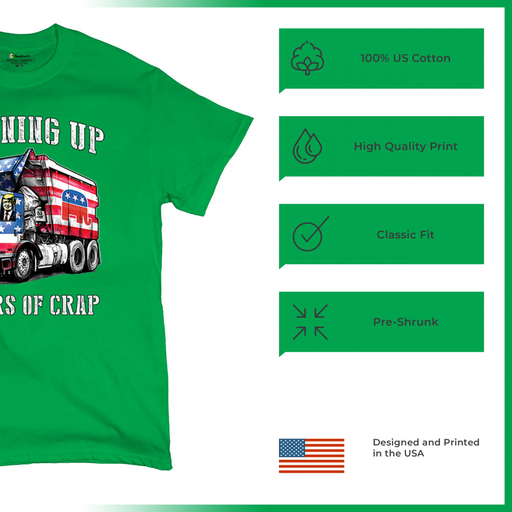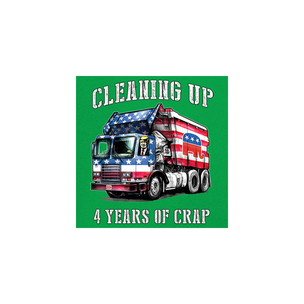 Bold "Cleaning Up 4 Years of Crap" design featuring Trump, the GOP, and the American flag. Perfect for proud conservatives and patriots.