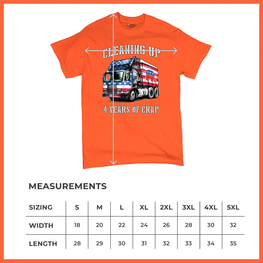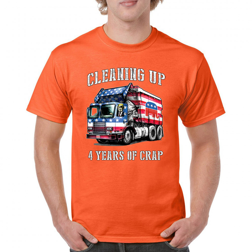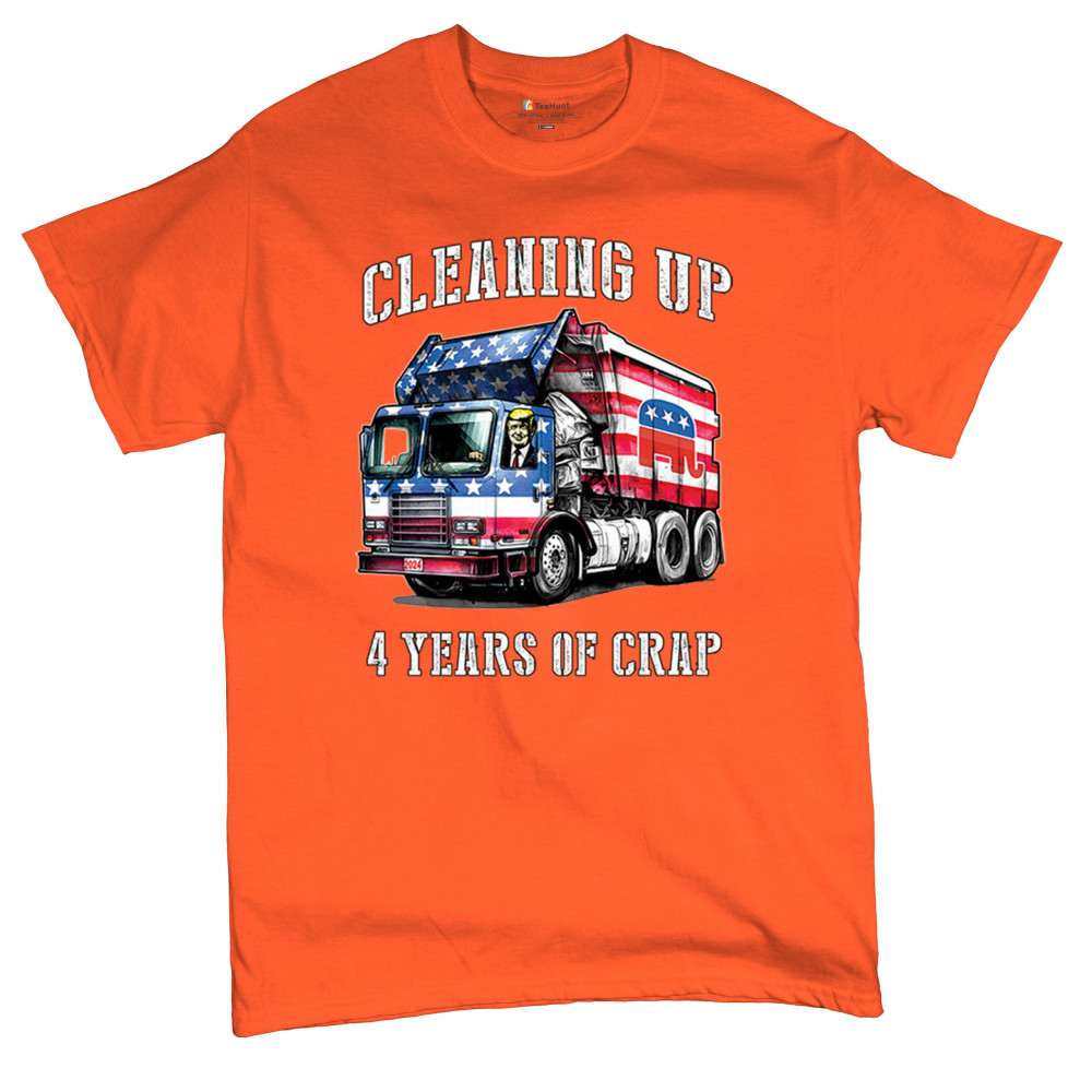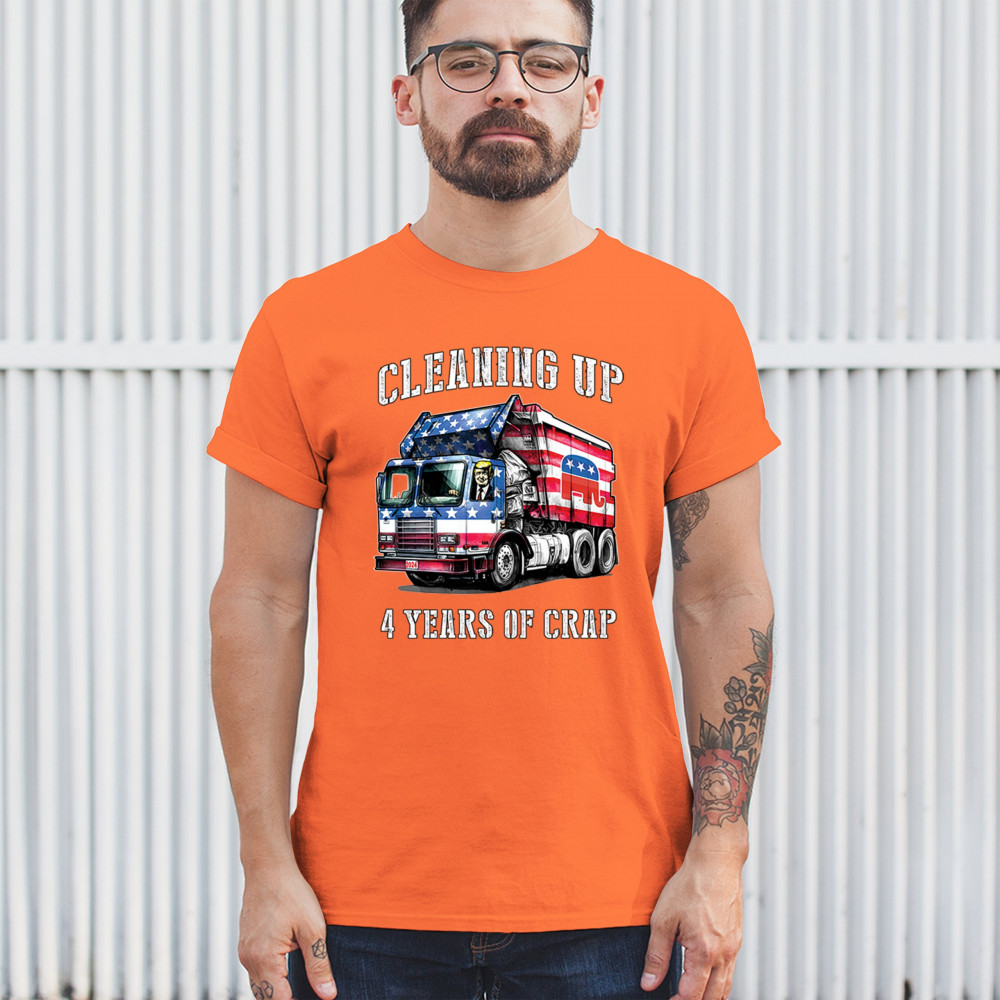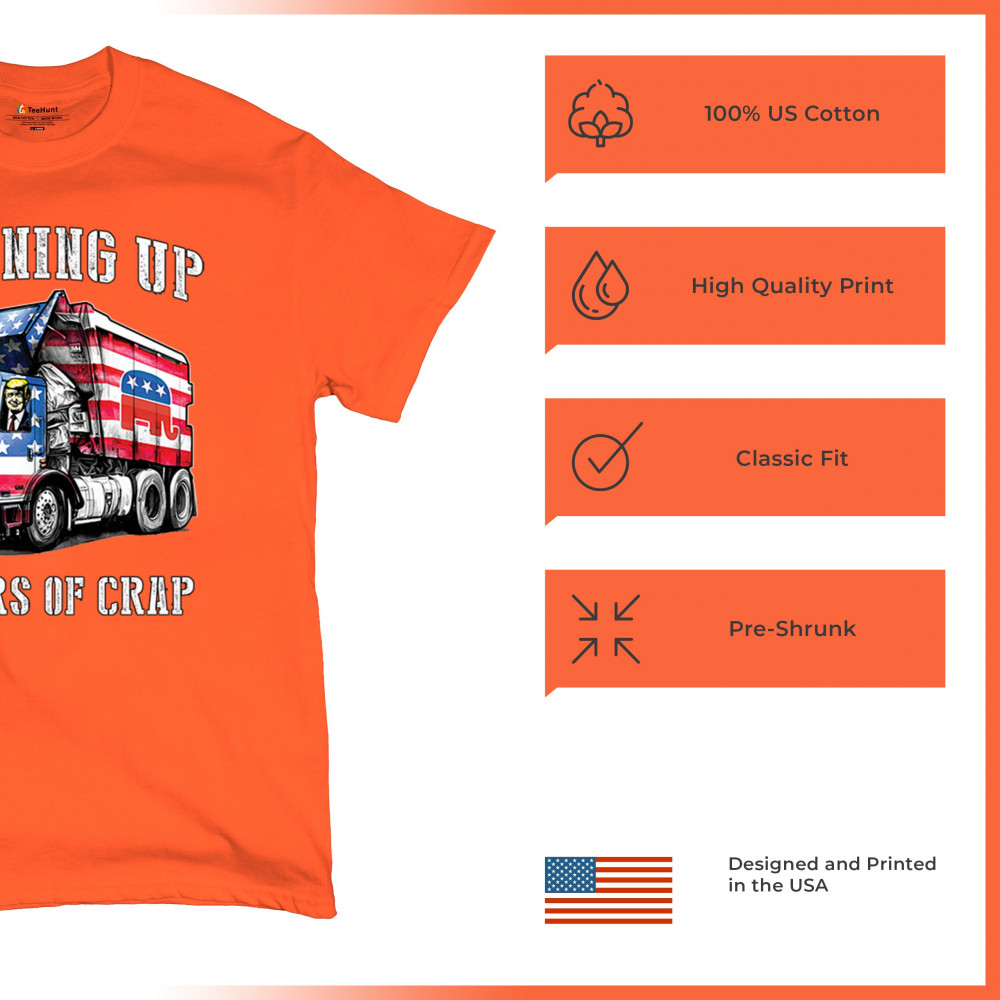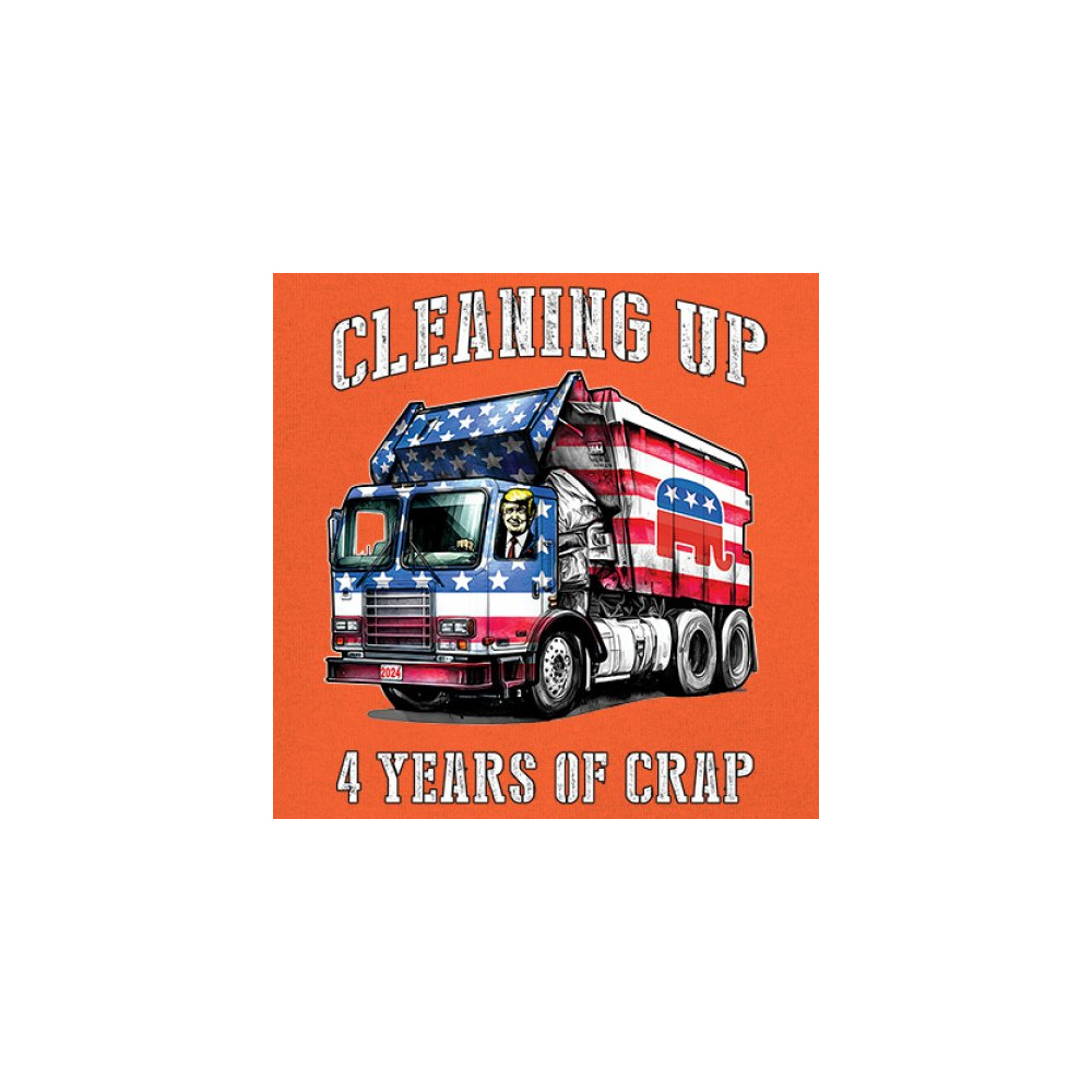 Bold "Cleaning Up 4 Years of Crap" design featuring Trump, the GOP, and the American flag. Perfect for proud conservatives and patriots.