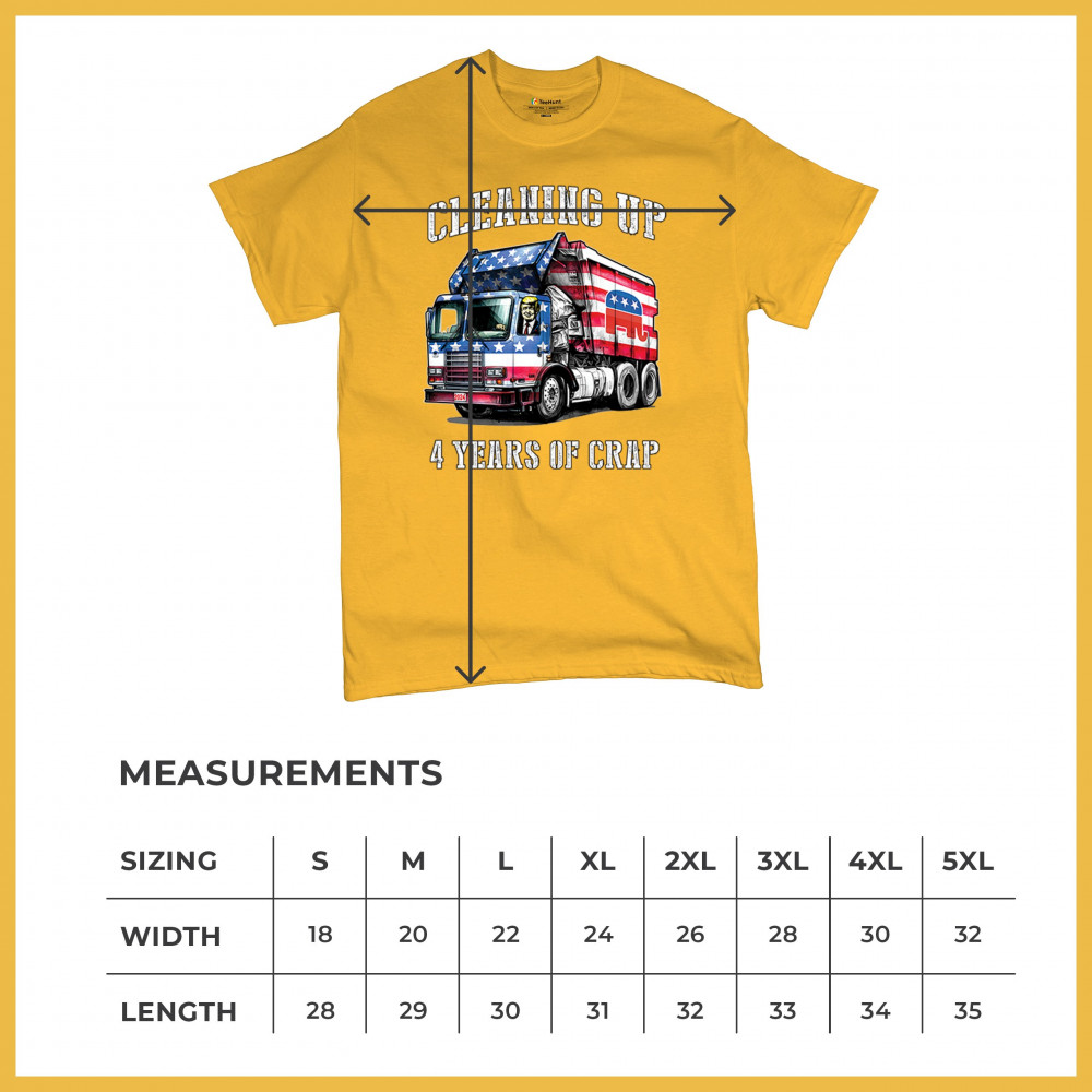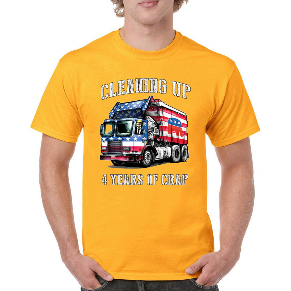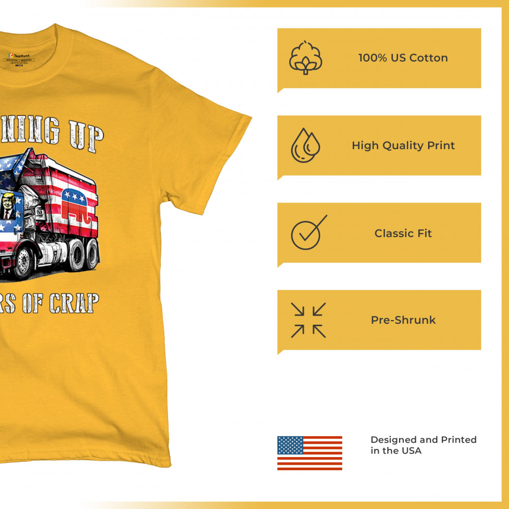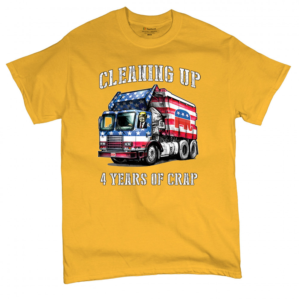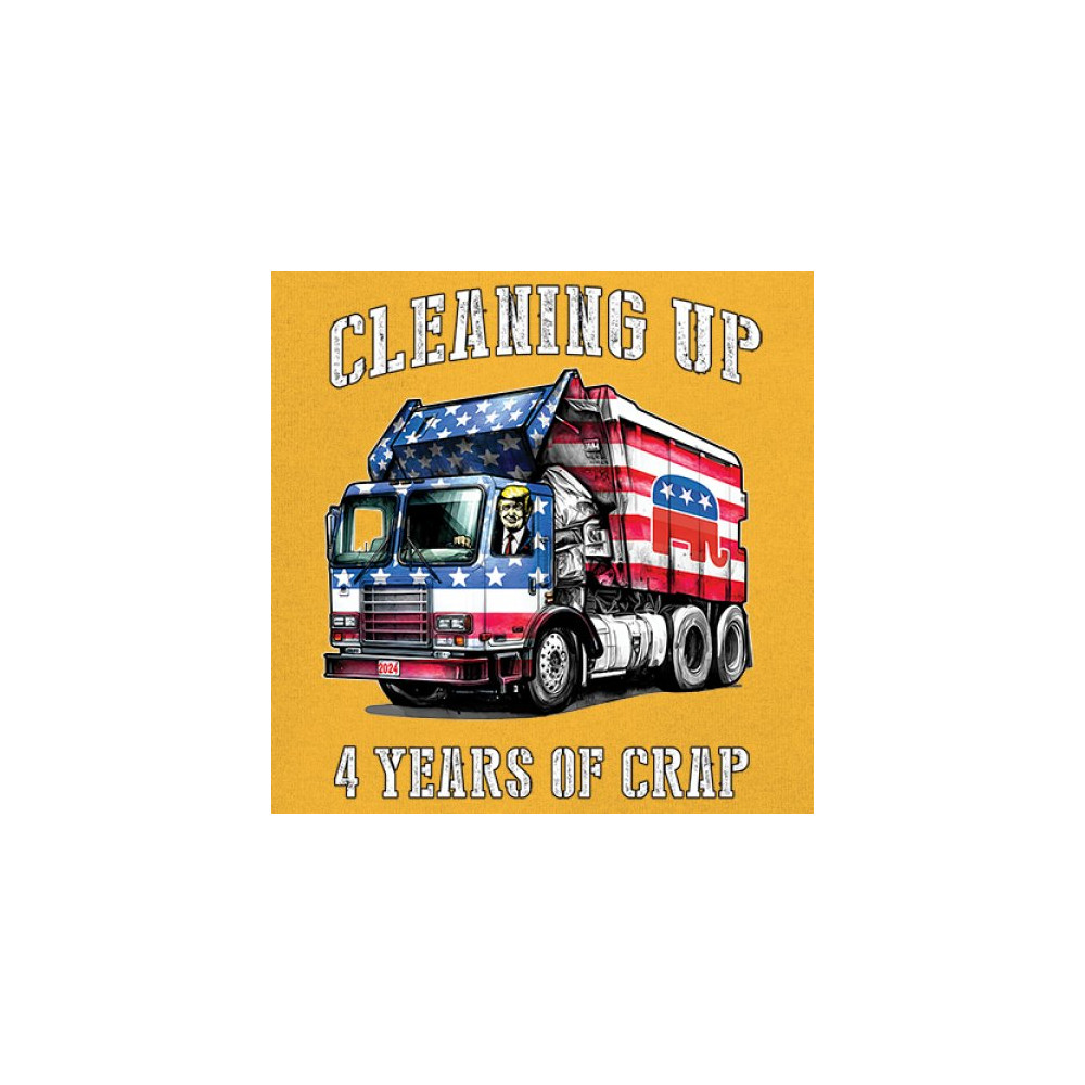 Bold "Cleaning Up 4 Years of Crap" design featuring Trump, the GOP, and the American flag. Perfect for proud conservatives and patriots.