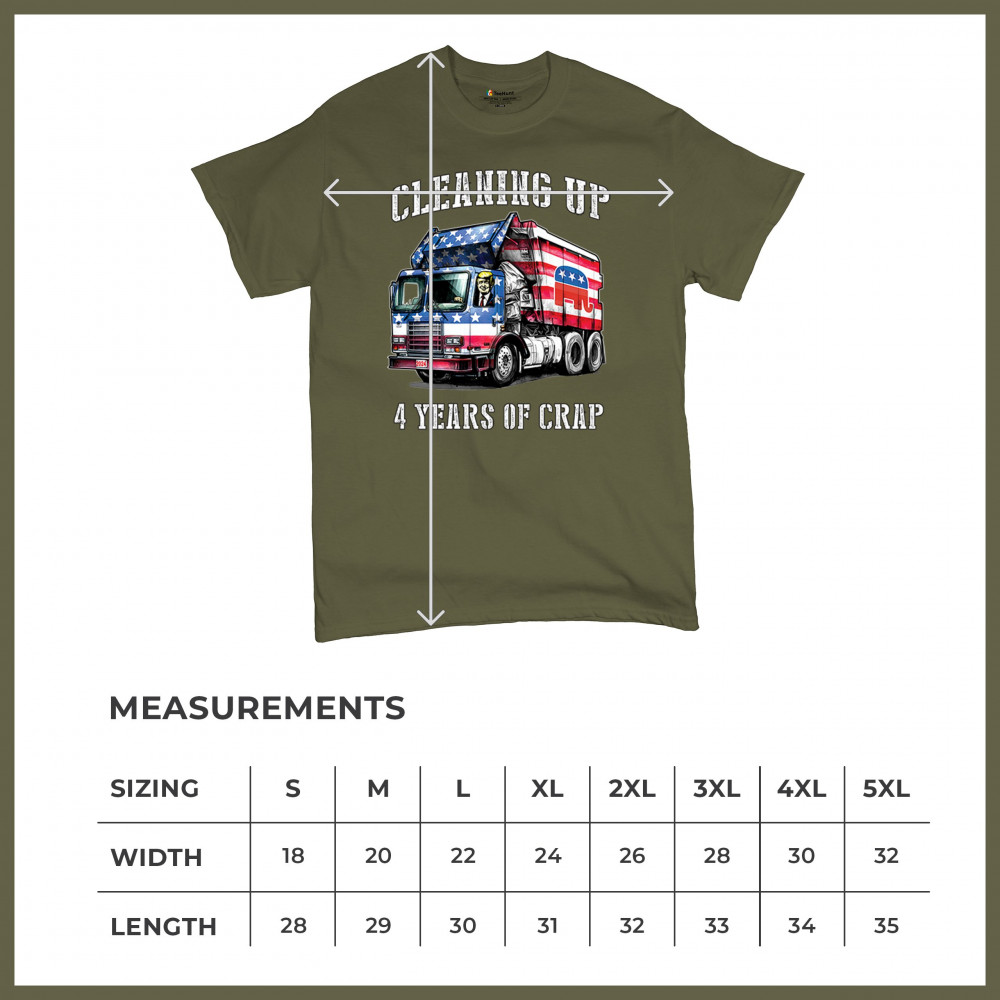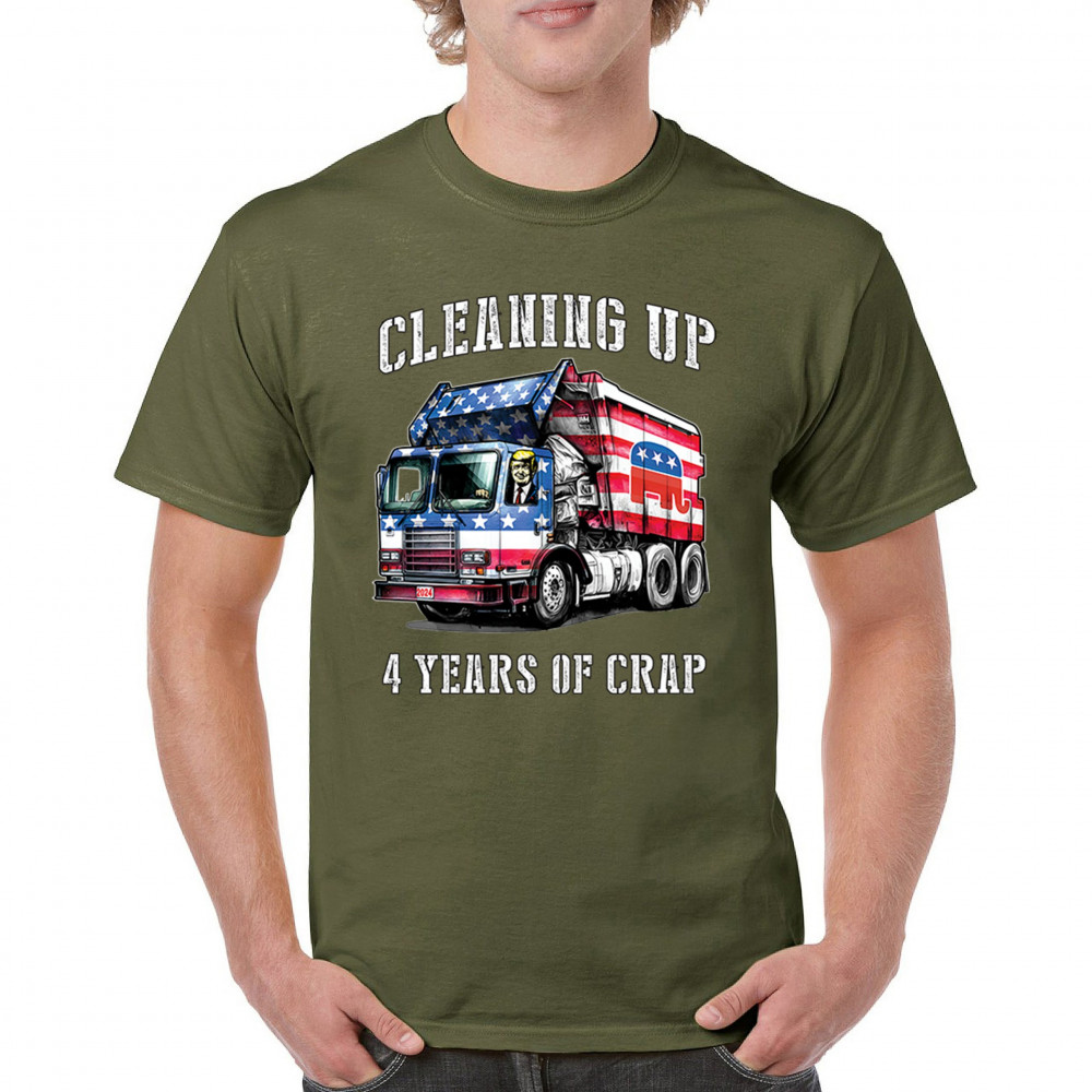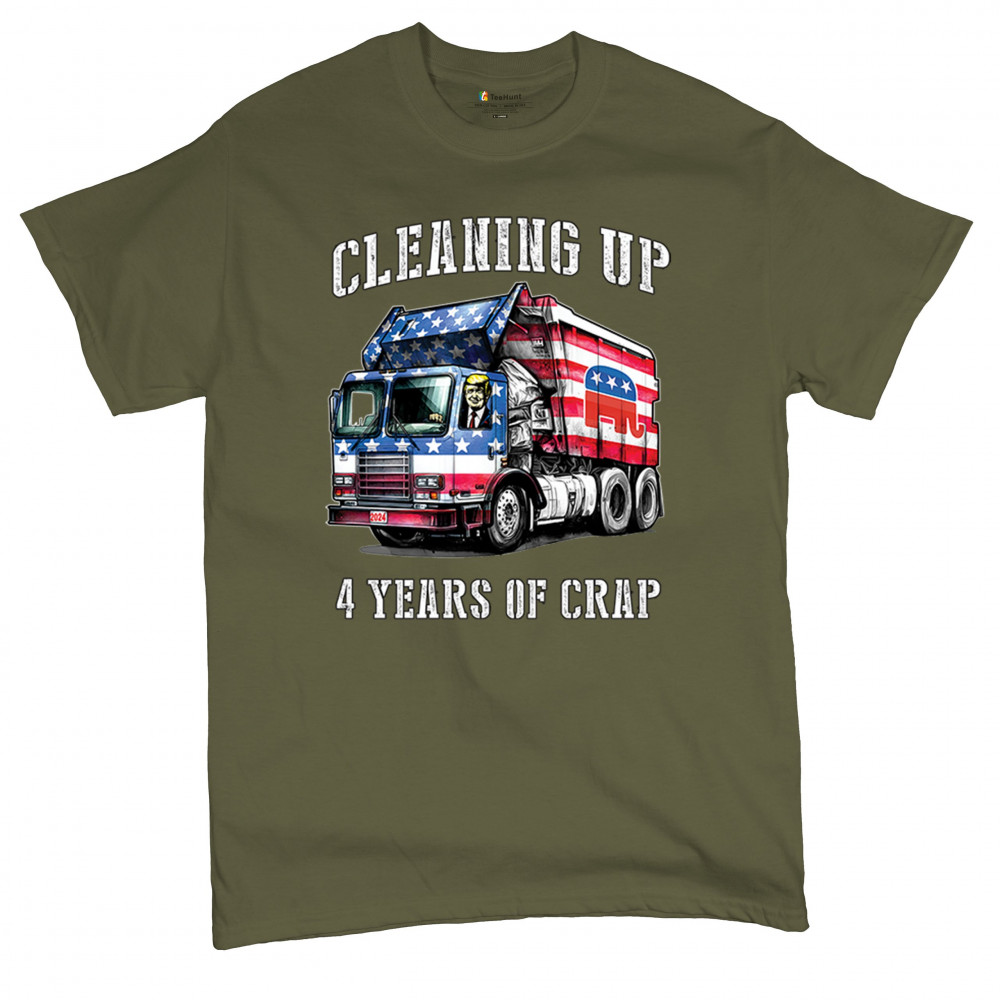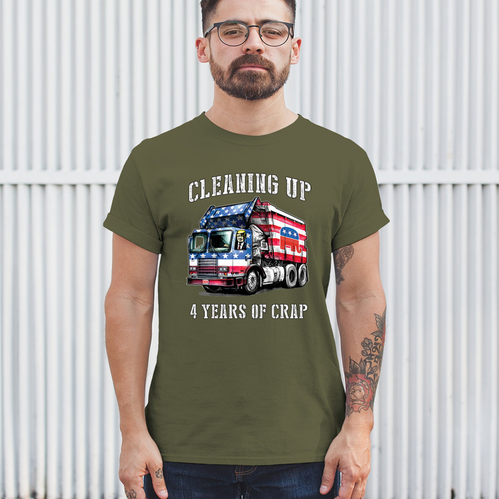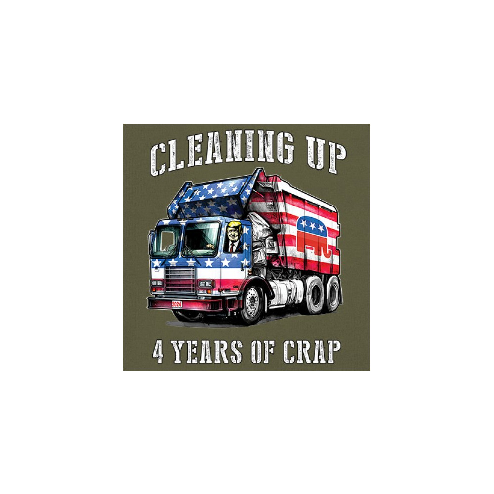 Bold "Cleaning Up 4 Years of Crap" design featuring Trump, the GOP, and the American flag. Perfect for proud conservatives and patriots.