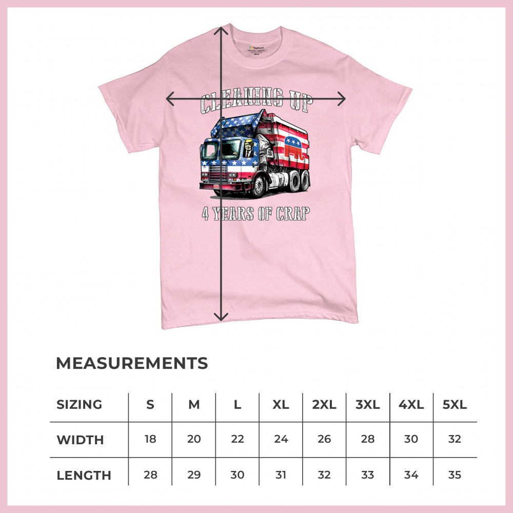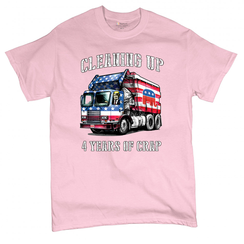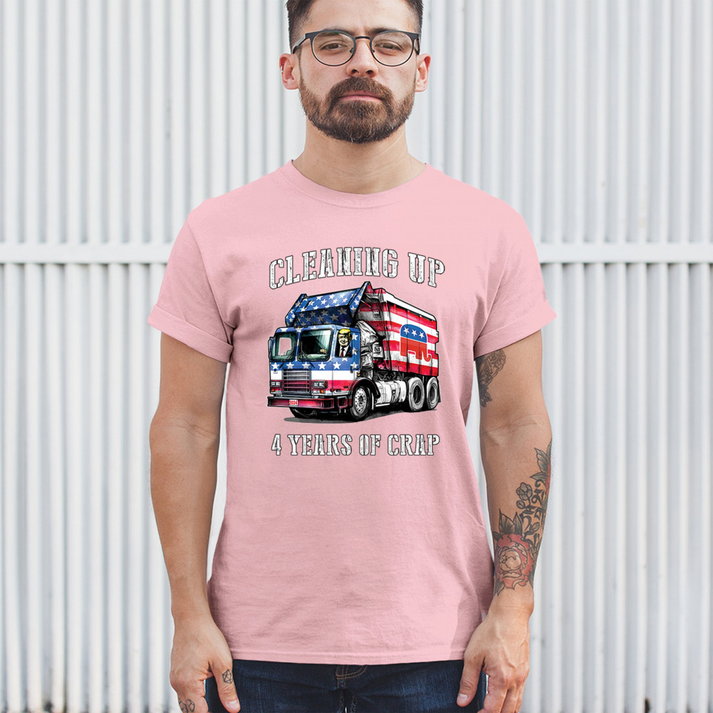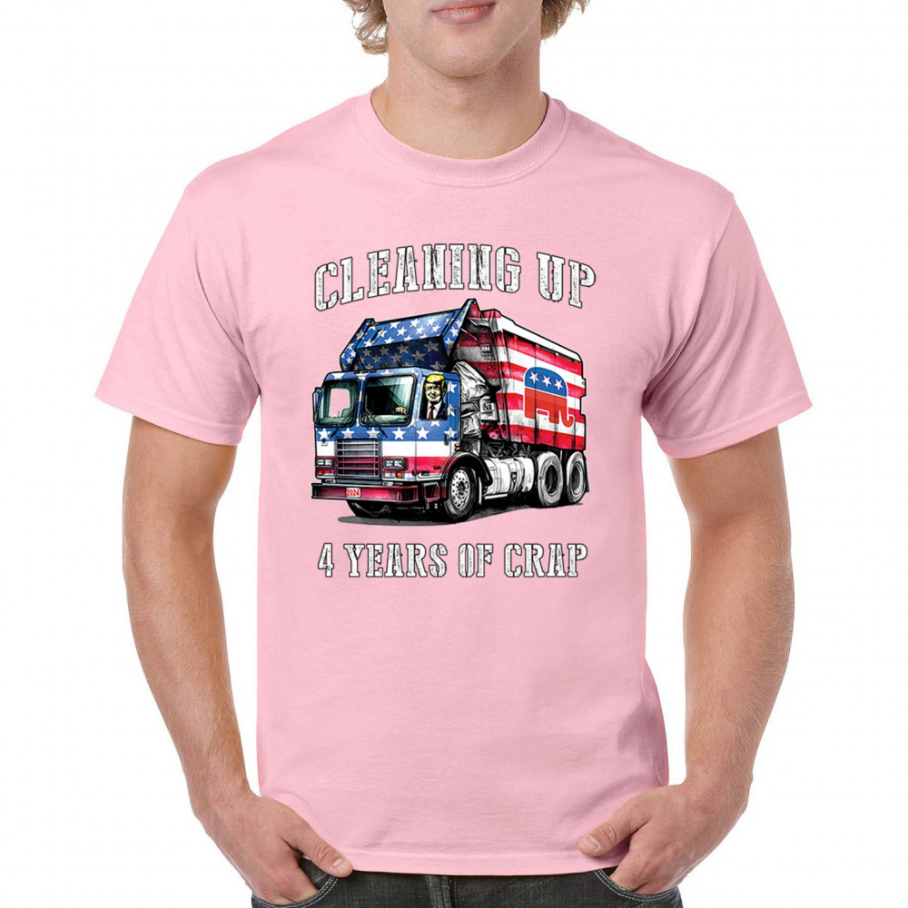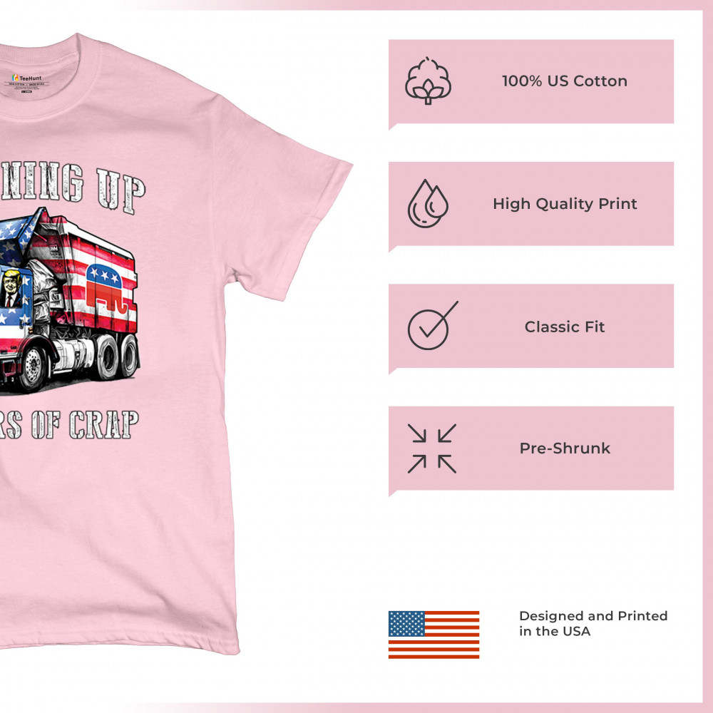 Bold "Cleaning Up 4 Years of Crap" design featuring Trump, the GOP, and the American flag. Perfect for proud conservatives and patriots.