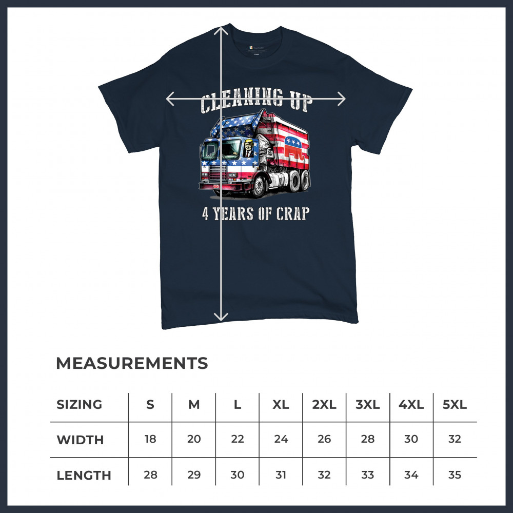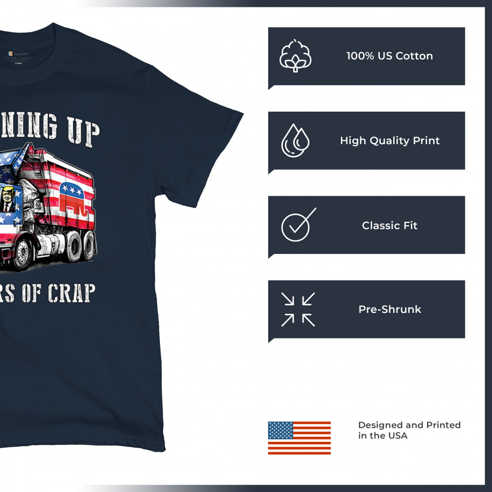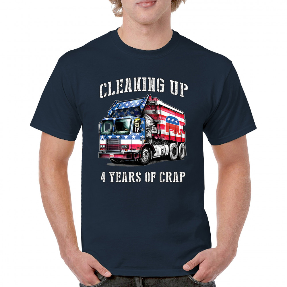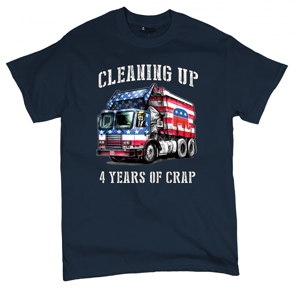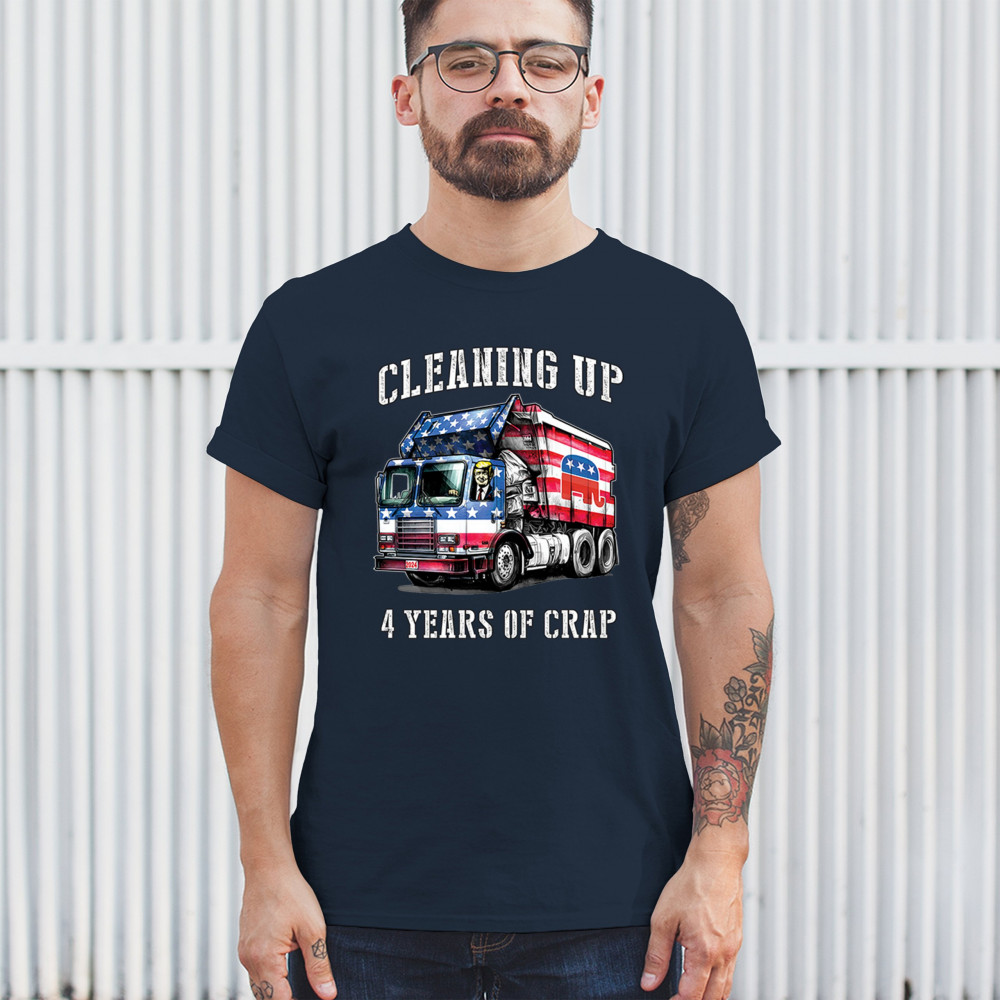 Bold "Cleaning Up 4 Years of Crap" design featuring Trump, the GOP, and the American flag. Perfect for proud conservatives and patriots.