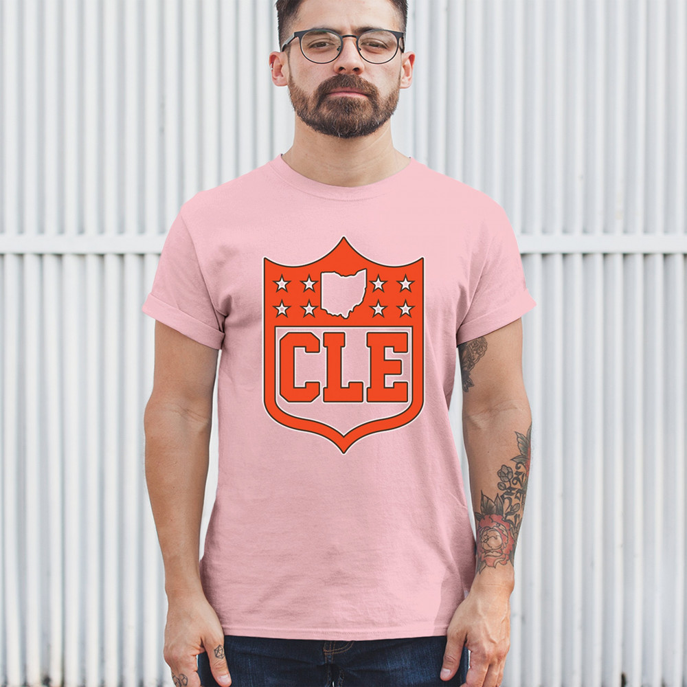 Bold CLE shield design honoring Cleveland football nation with Rust Belt pride, underdog grit, and blue collar sports heritage.