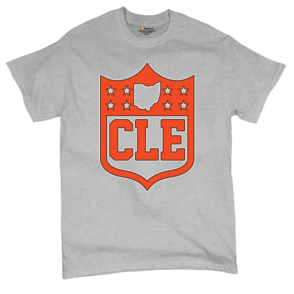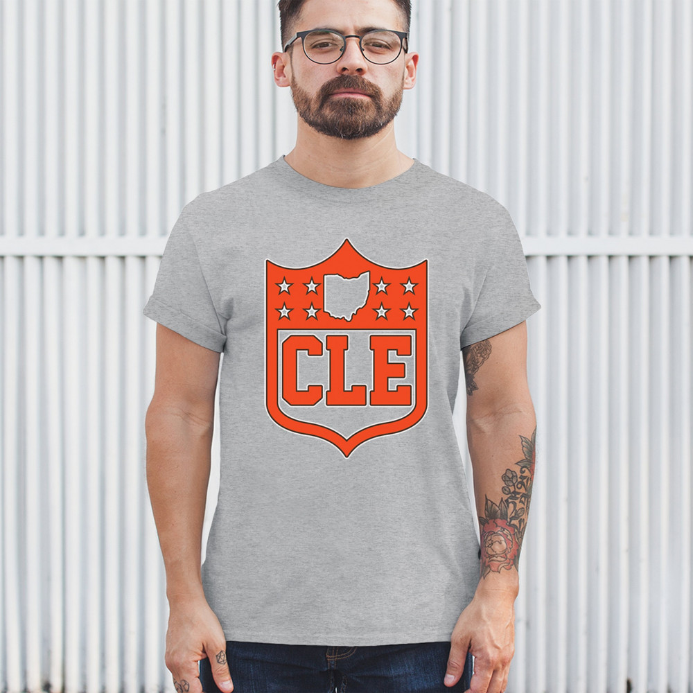 Bold CLE shield design honoring Cleveland football nation with Rust Belt pride, underdog grit, and blue collar sports heritage.