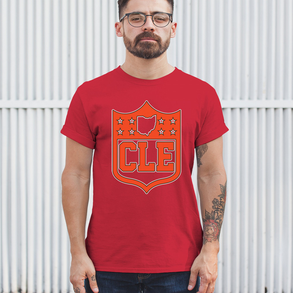 Bold CLE shield design honoring Cleveland football nation with Rust Belt pride, underdog grit, and blue collar sports heritage.