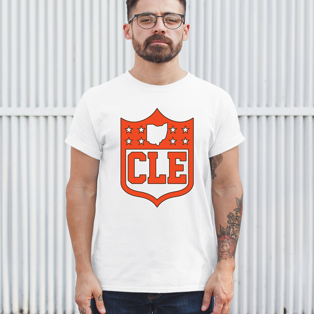 Bold CLE shield design honoring Cleveland football nation with Rust Belt pride, underdog grit, and blue collar sports heritage.