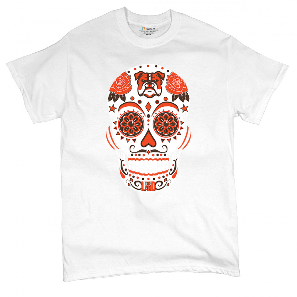 Cleveland Sugar Skull with Lake Erie pride, Rust Belt football grit, orange & brown tradition, playoff vibes, and Game Day passion.
