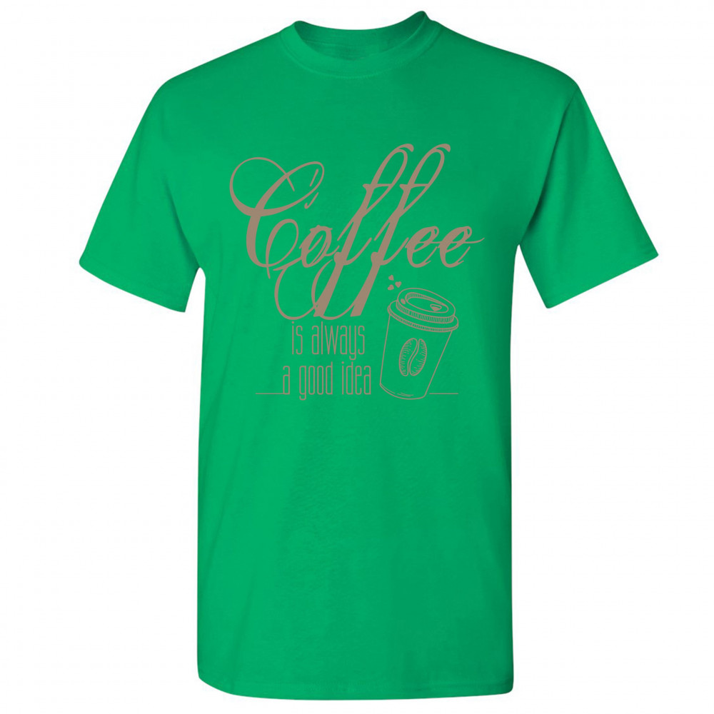 A print saying "Coffee is always a good idea". The print features a picture of a paper cup of tea with a coffee bean on it and with several hearts steaming from it. A great choice to wear to spread positive vibes and show what a passionate coffee fan you