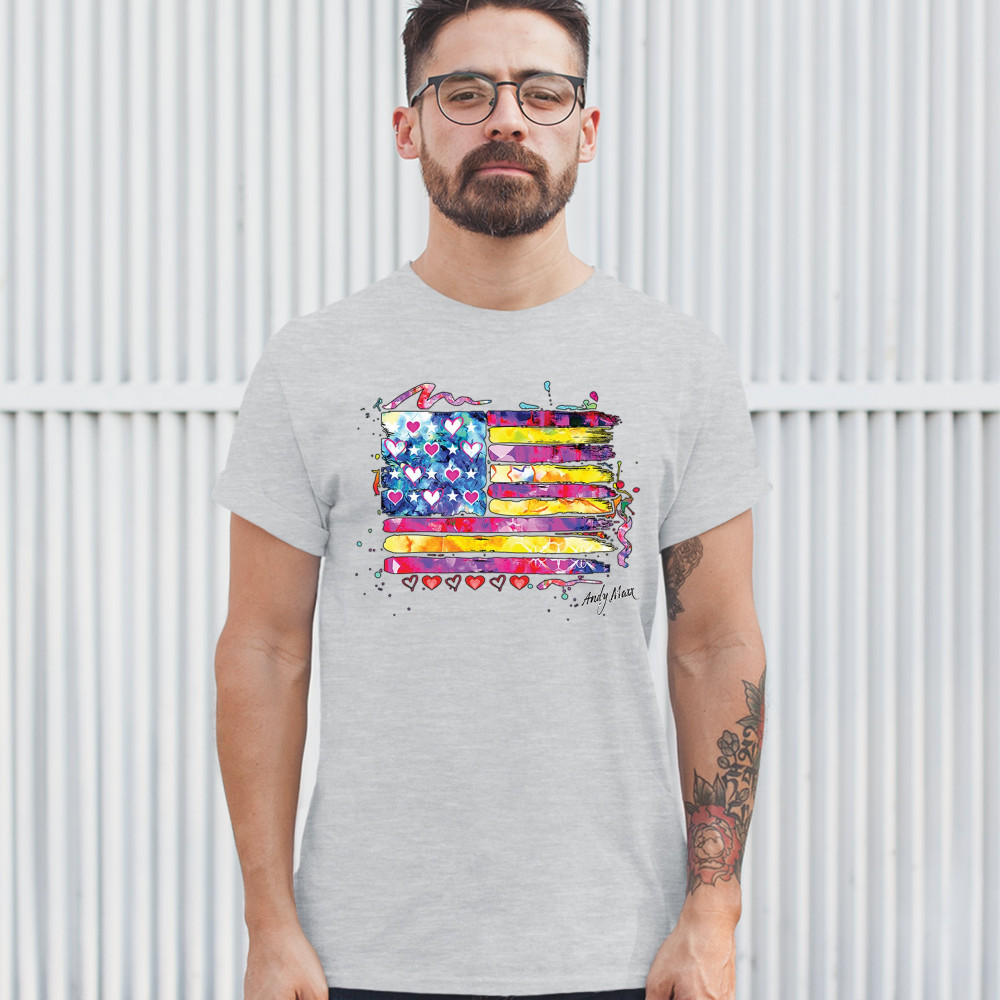 A patriotic print featuring a very colorful American Flag created by Andy Maxx. Great choice to wear on Independence Day or any other patriotic holiday.