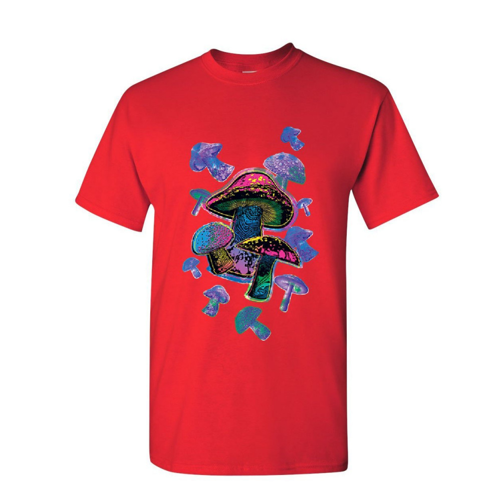 NEON MUSHROOMS colorful t-shirt shrooms psychedelic psilocybin mens tee shirt red
