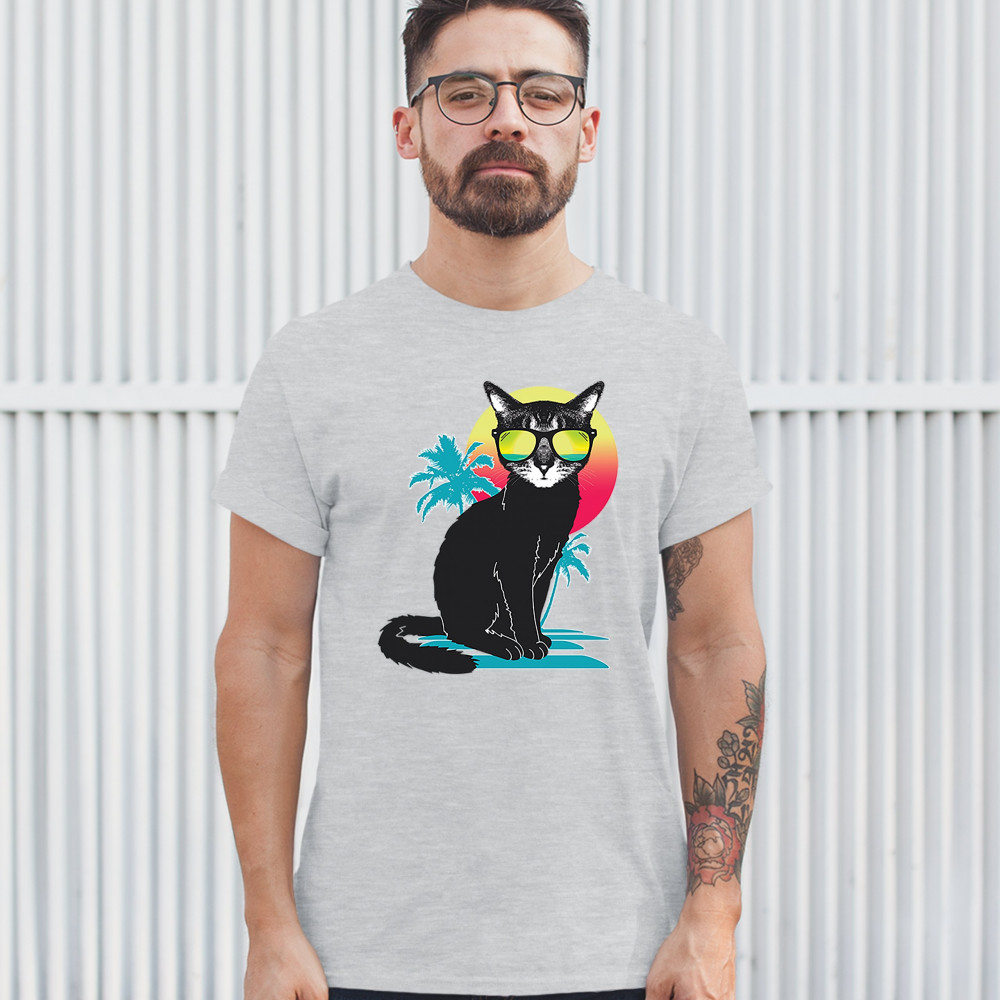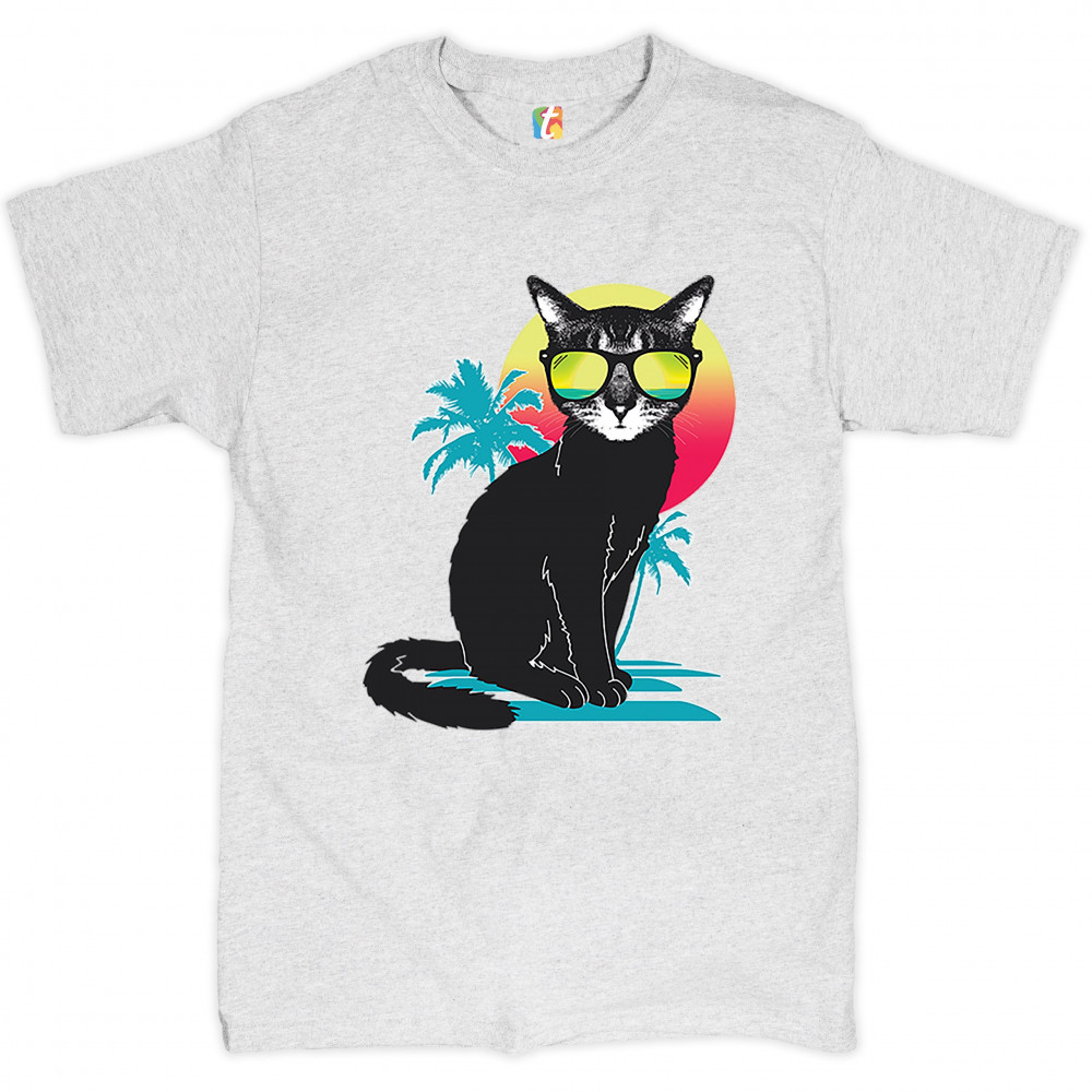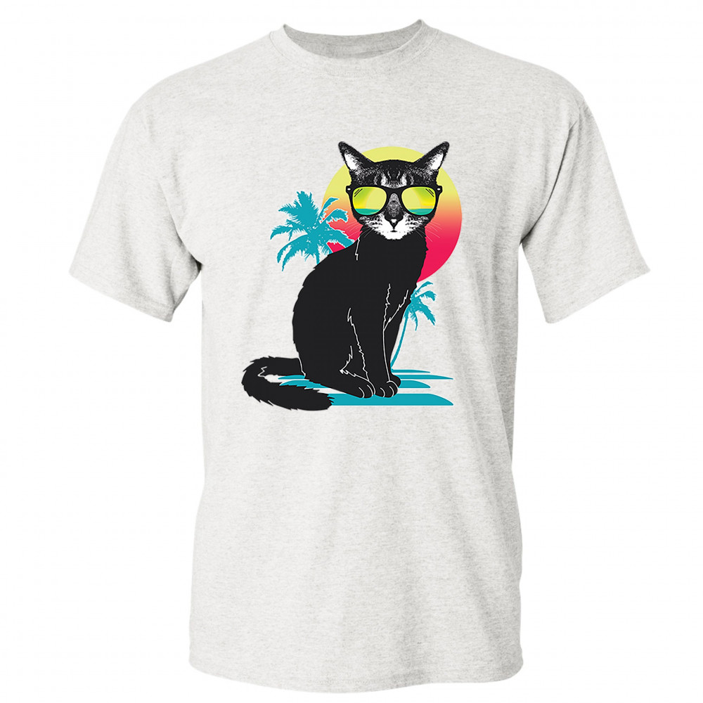 COOL SUMMER CAT t-shirt neon kitty on a beach animal lovers men's tee ash gray