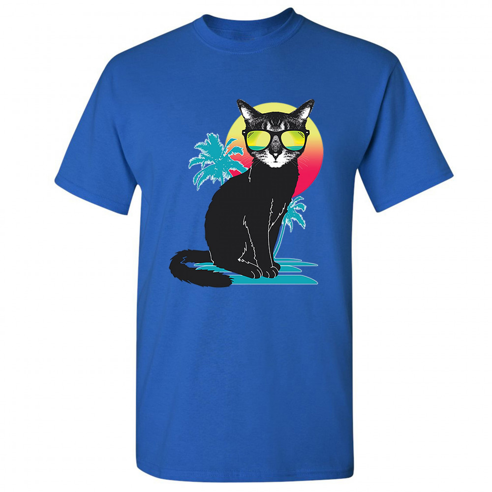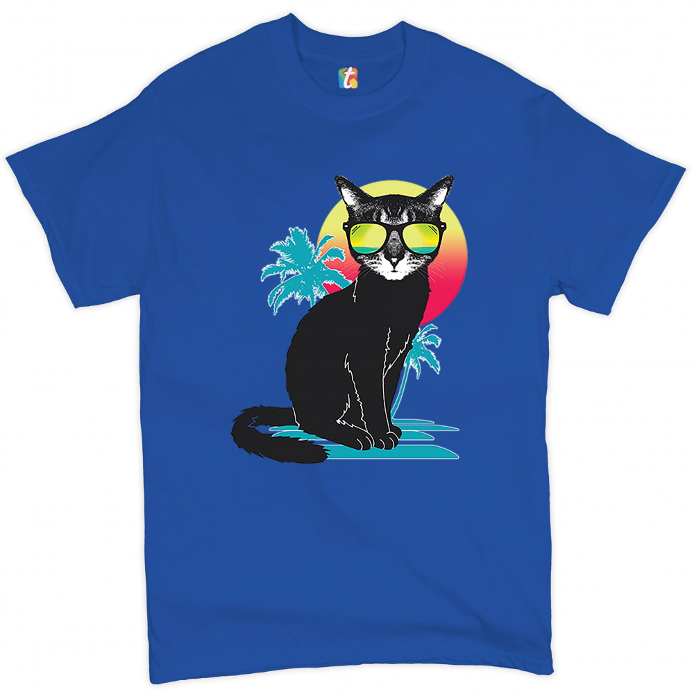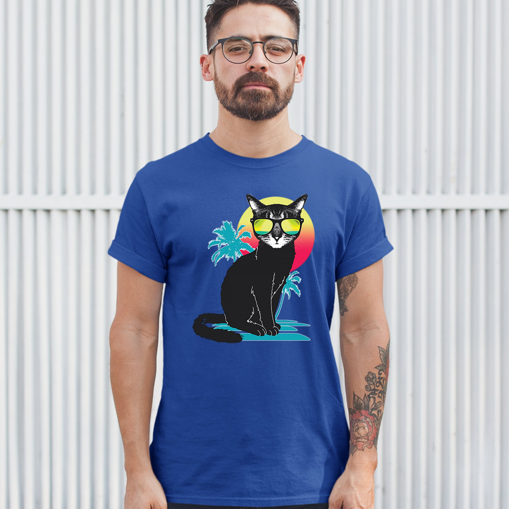 COOL SUMMER CAT t-shirt neon kitty on a beach animal lovers men's tee royal blue