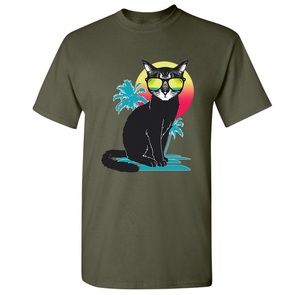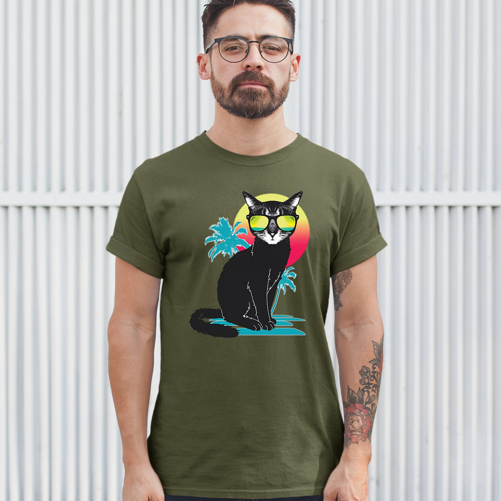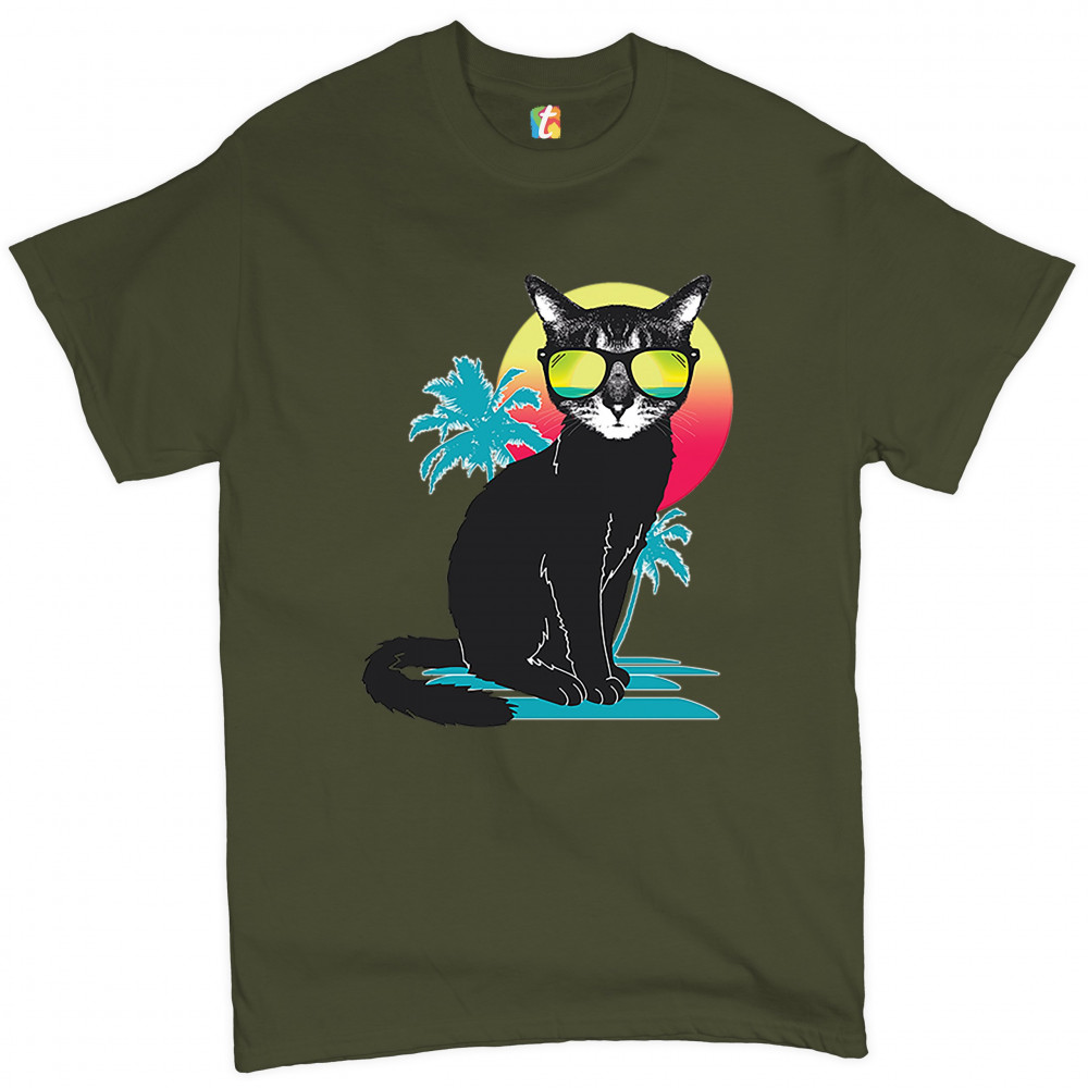 COOL SUMMER CAT t-shirt neon kitty on a beach animal lovers men's tee military green
