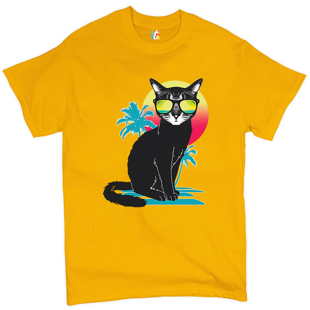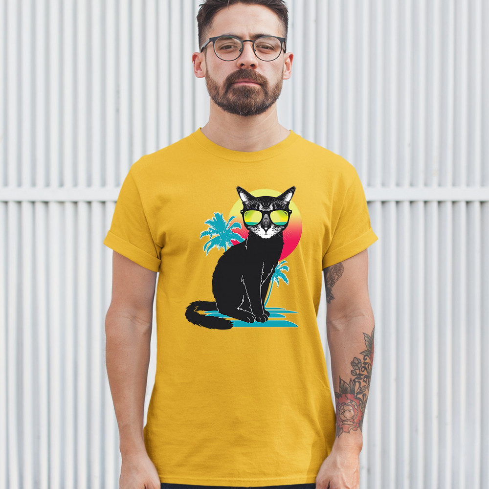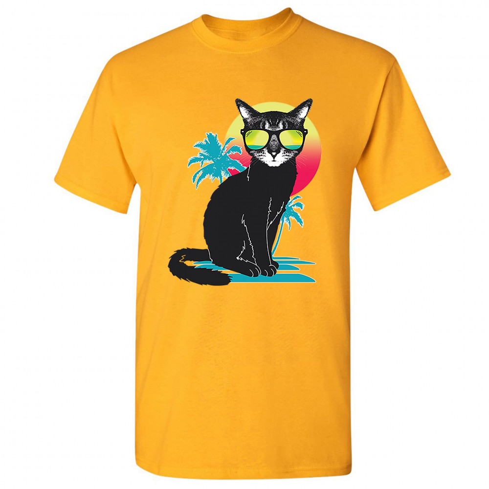 COOL SUMMER CAT t-shirt neon kitty on a beach animal lovers men's tee yellow