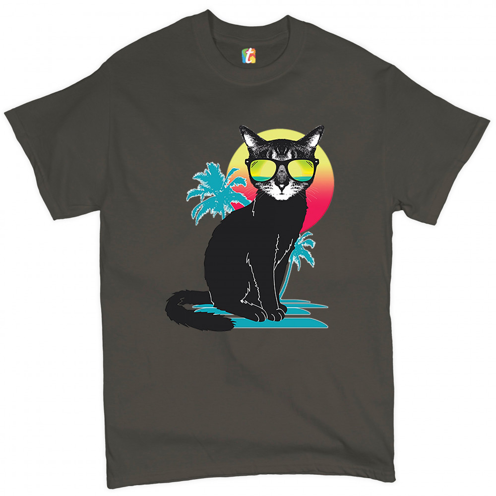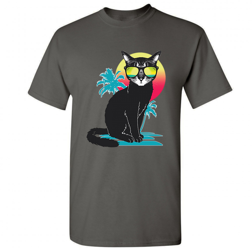 COOL SUMMER CAT t-shirt neon kitty on a beach animal lovers men's tee charcoal