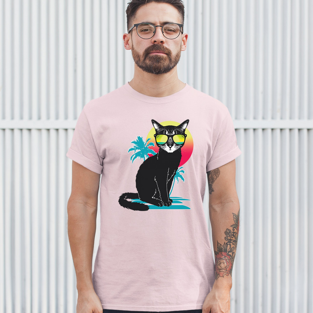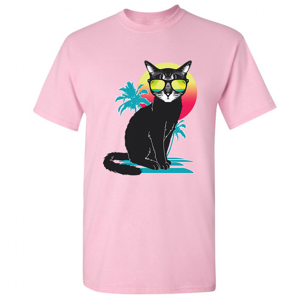 COOL SUMMER CAT t-shirt neon kitty on a beach animal lovers men's tee light pink