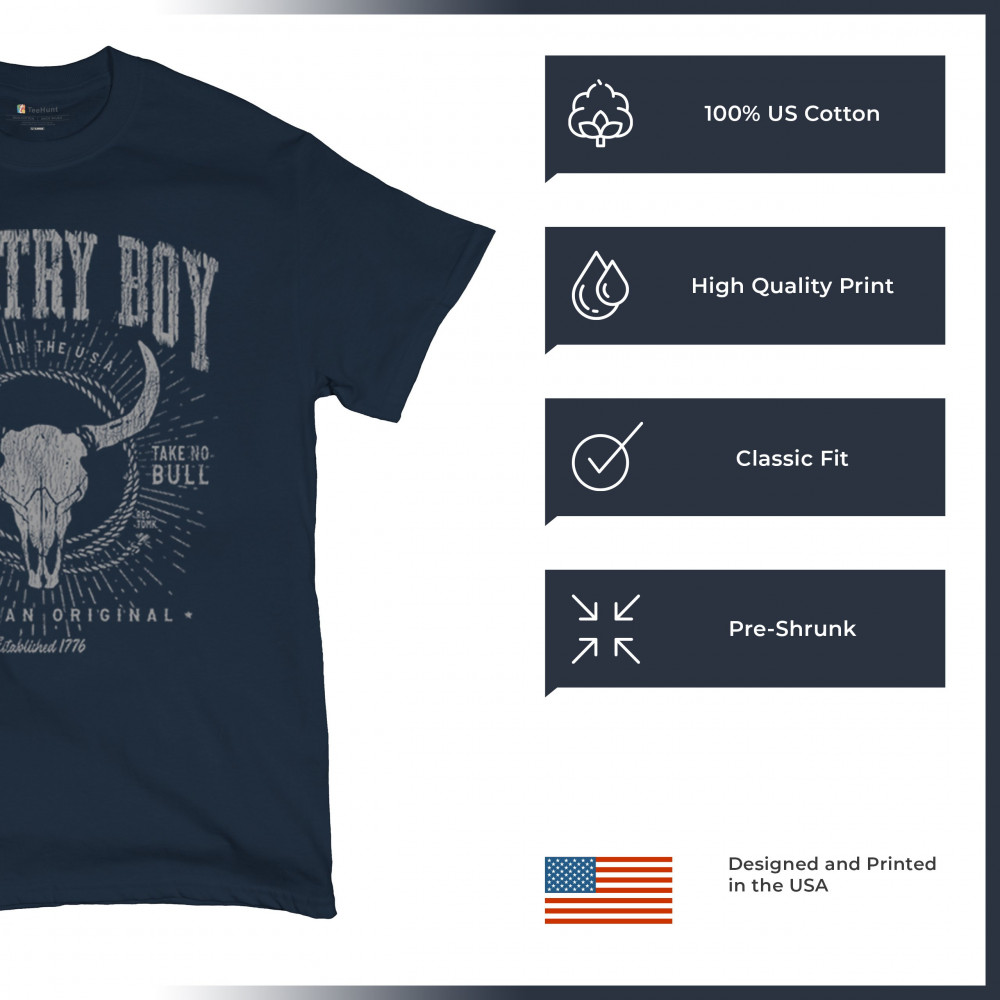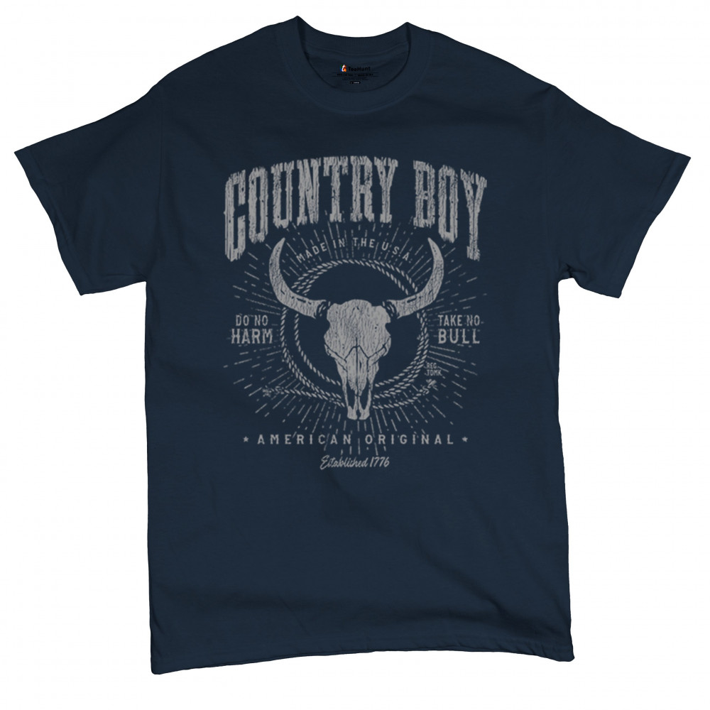 Bold country boy design with bull skull, distressed western style, patriotic grit, and the phrase “Do No Harm, Take No Bull.â€