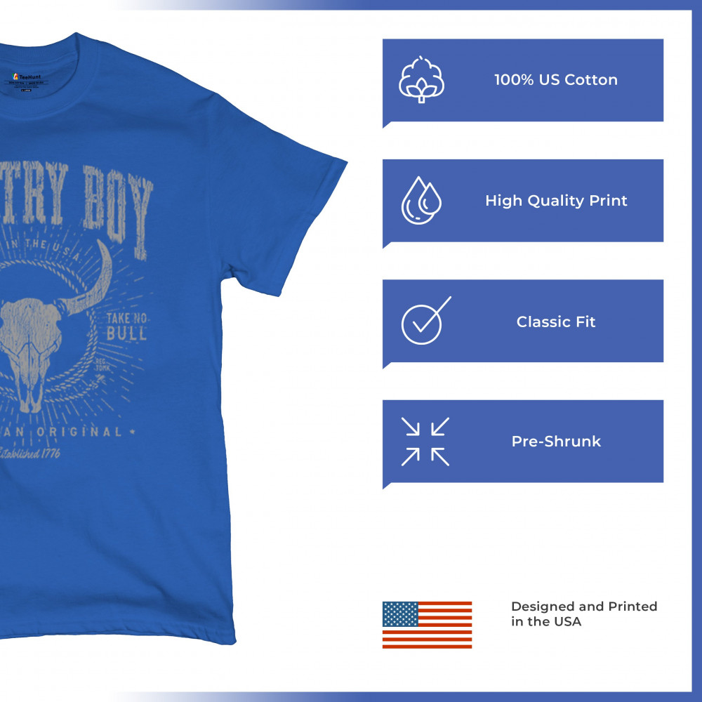 Bold country boy design with bull skull, distressed western style, patriotic grit, and the phrase “Do No Harm, Take No Bull.â€