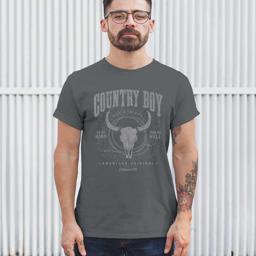 Bold country boy design with bull skull, distressed western style, patriotic grit, and the phrase “Do No Harm, Take No Bull.â€