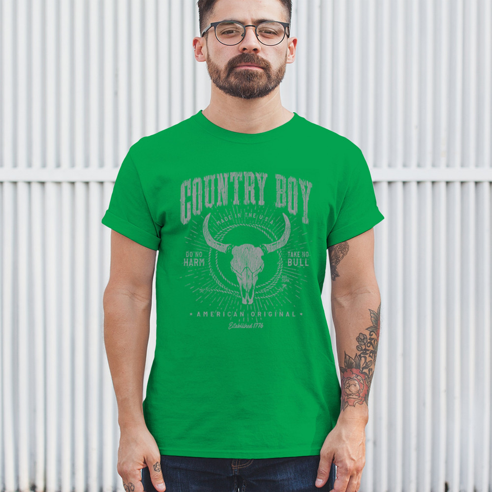Bold country boy design with bull skull, distressed western style, patriotic grit, and the phrase “Do No Harm, Take No Bull.â€