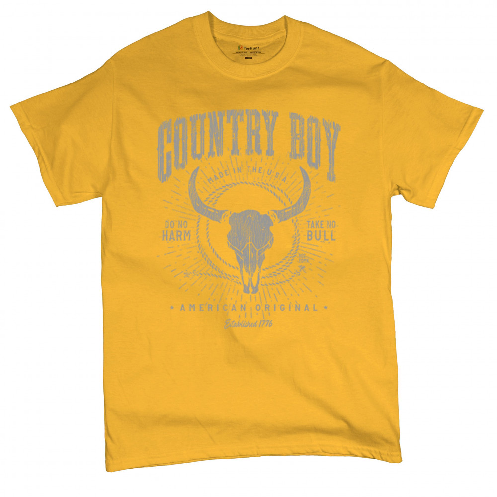 Bold country boy design with bull skull, distressed western style, patriotic grit, and the phrase “Do No Harm, Take No Bull.â€