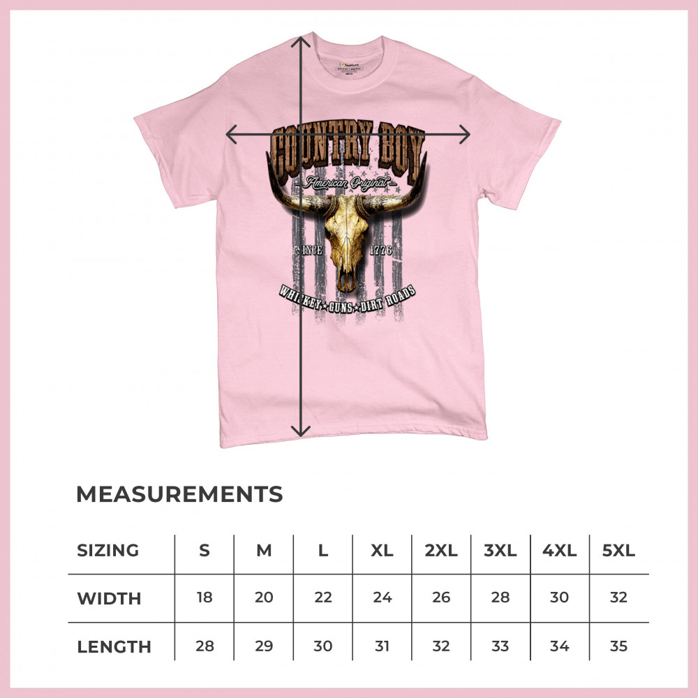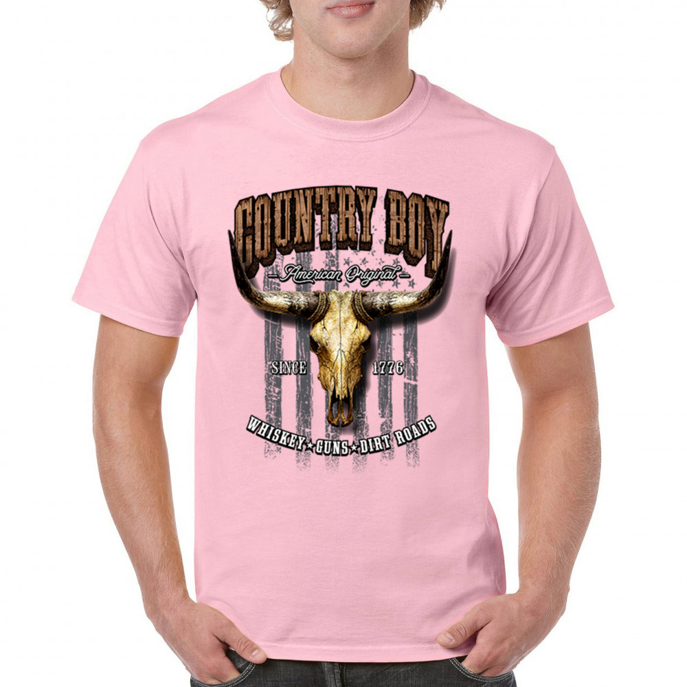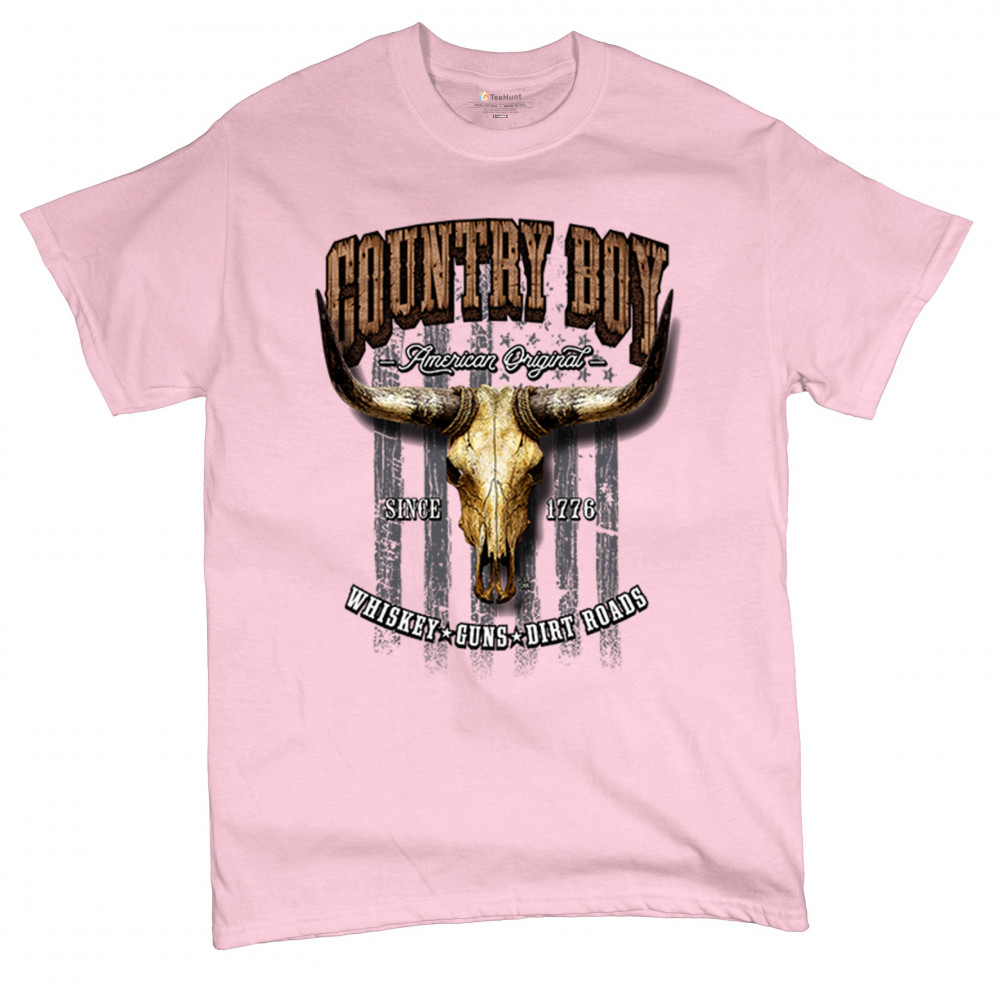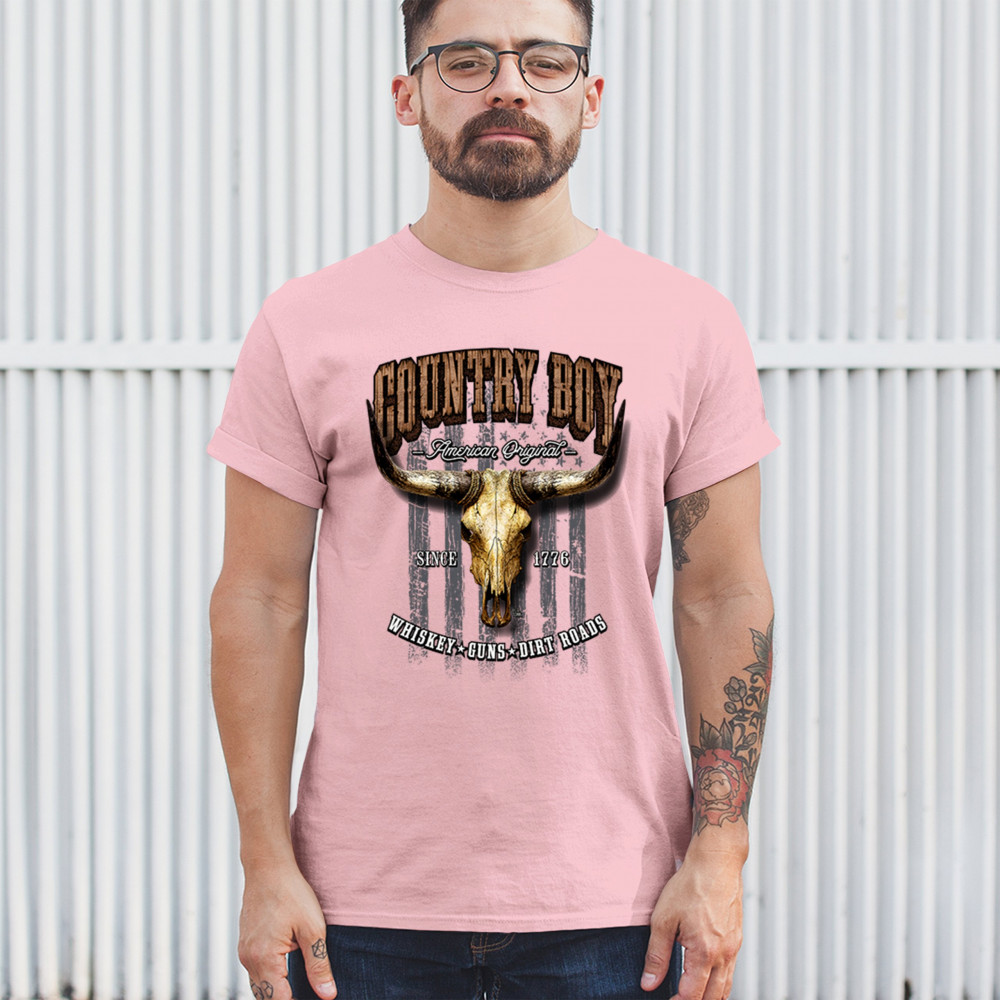 Country Boy – American Original. This bold western design captures the essence of southern living with a vintage bull skull, rustic lettering, and pride in whiskey, guns, and dirt roads. From 1776 to today, it honors the heritage of freedom-loving country men. Wear it to rodeos, bonfires, or muddy trails.