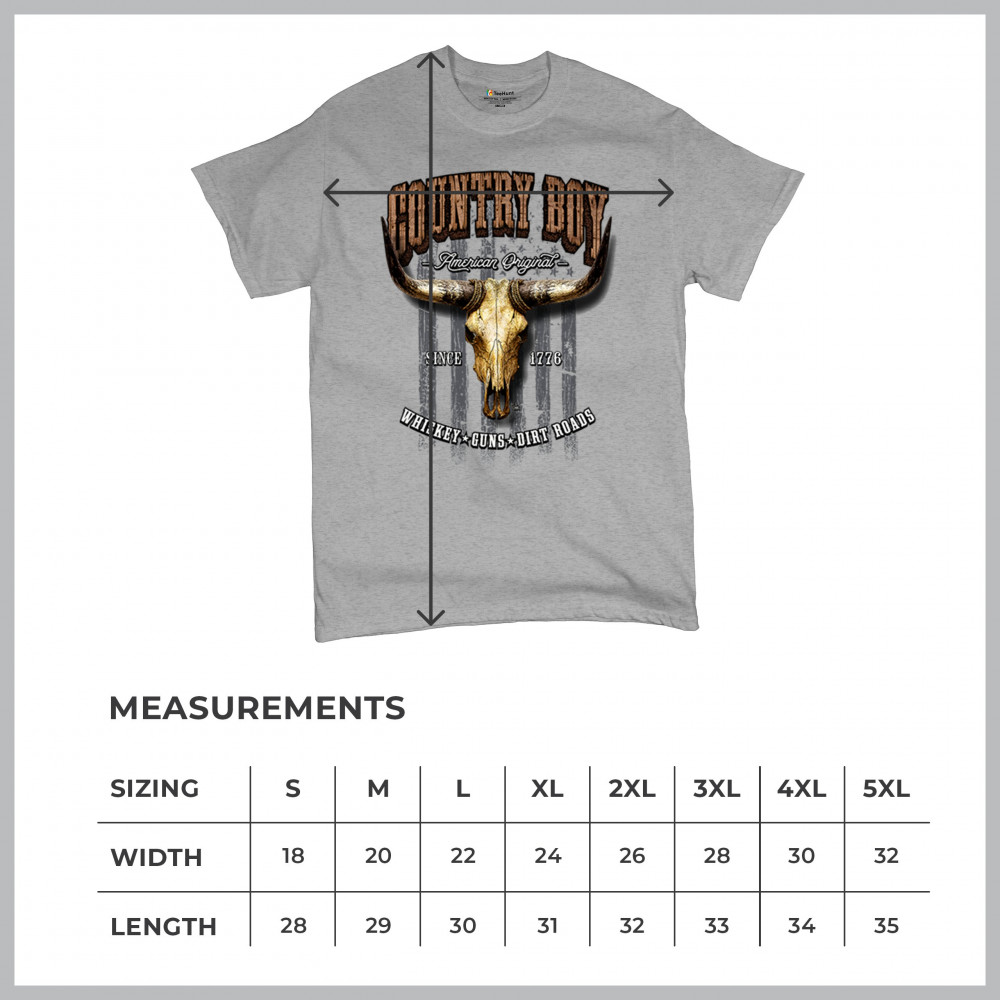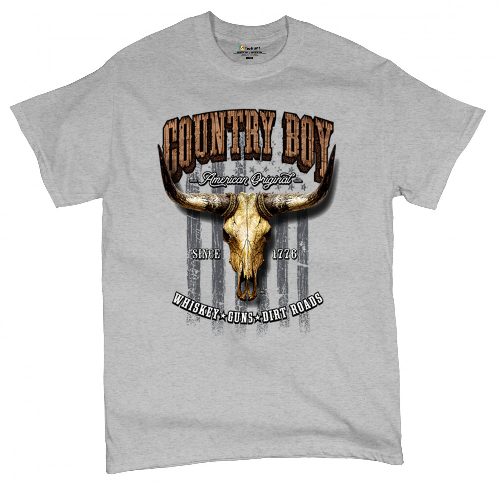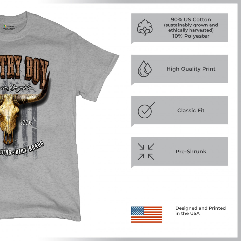Country Boy – American Original. This bold western design captures the essence of southern living with a vintage bull skull, rustic lettering, and pride in whiskey, guns, and dirt roads. From 1776 to today, it honors the heritage of freedom-loving country men. Wear it to rodeos, bonfires, or muddy trails.