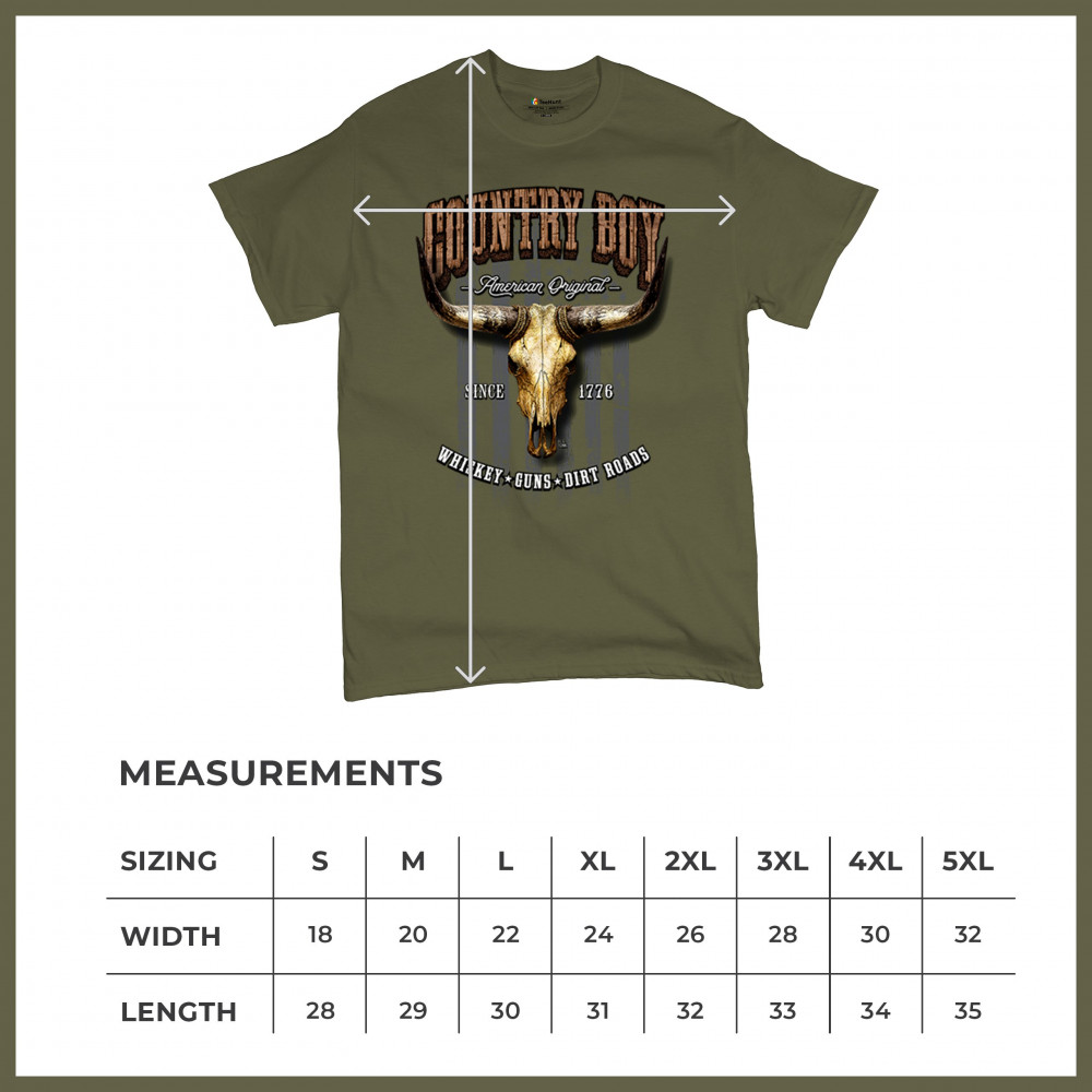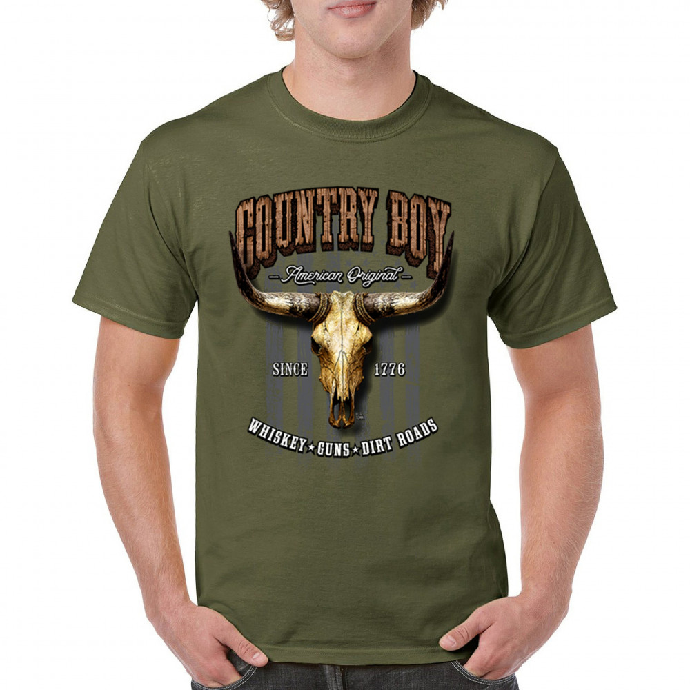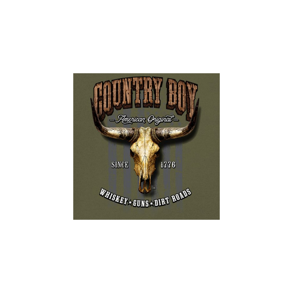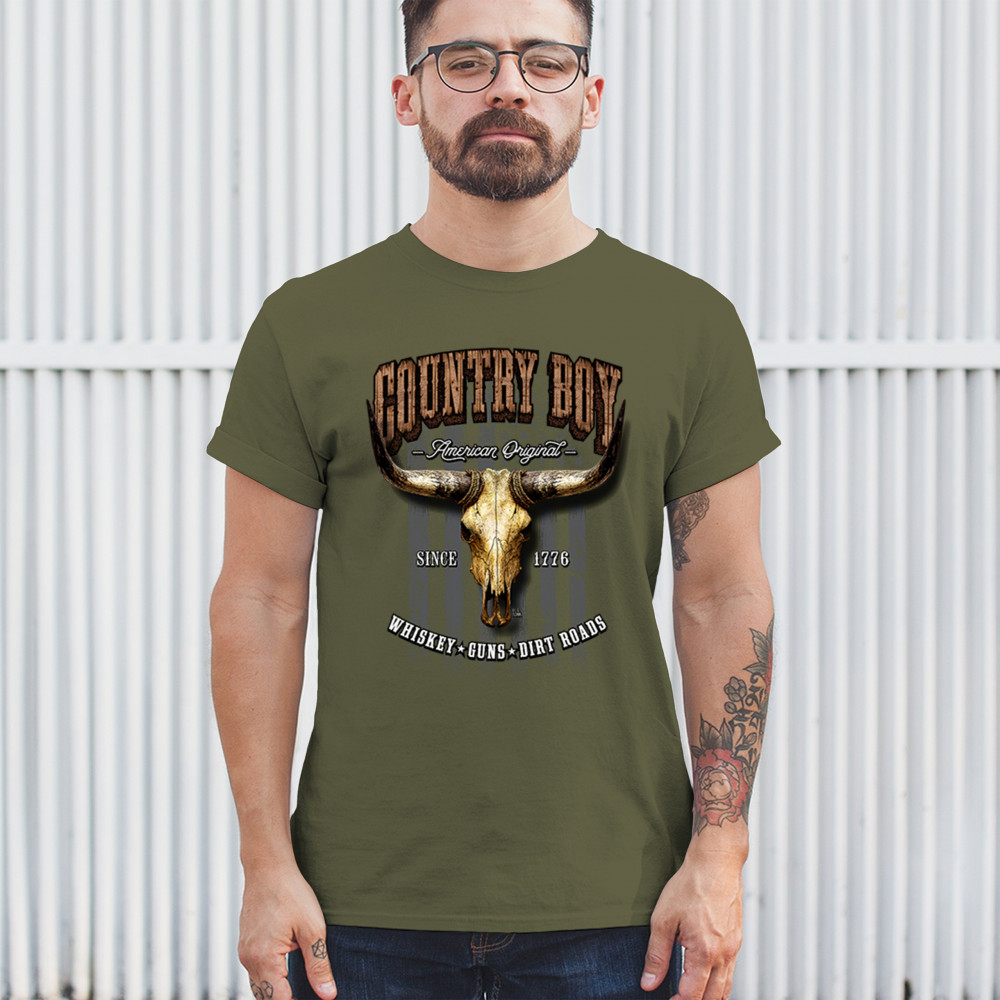 Country Boy – American Original. This bold western design captures the essence of southern living with a vintage bull skull, rustic lettering, and pride in whiskey, guns, and dirt roads. From 1776 to today, it honors the heritage of freedom-loving country men. Wear it to rodeos, bonfires, or muddy trails.