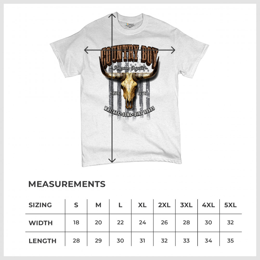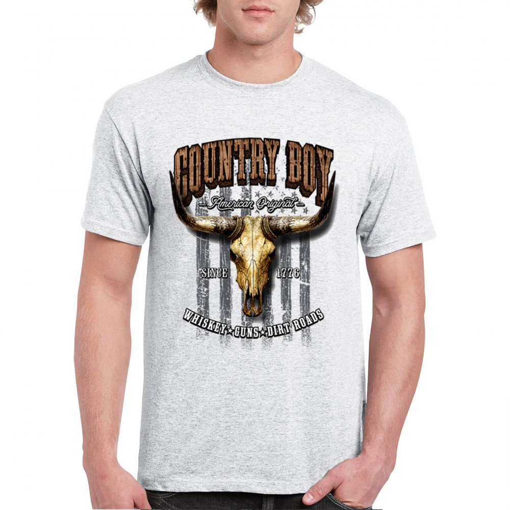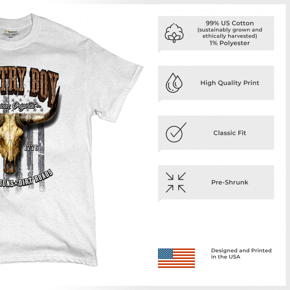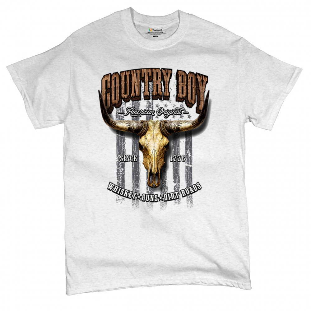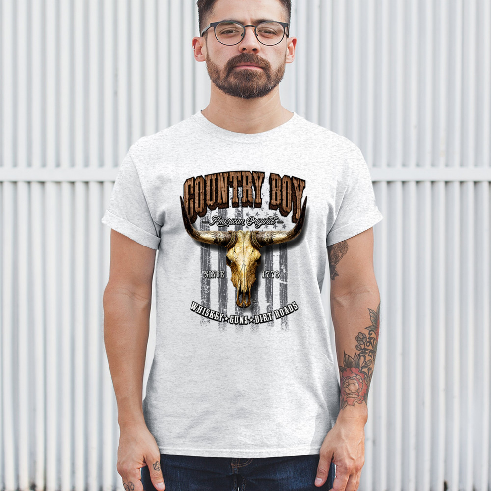 Country Boy – American Original. This bold western design captures the essence of southern living with a vintage bull skull, rustic lettering, and pride in whiskey, guns, and dirt roads. From 1776 to today, it honors the heritage of freedom-loving country men. Wear it to rodeos, bonfires, or muddy trails.