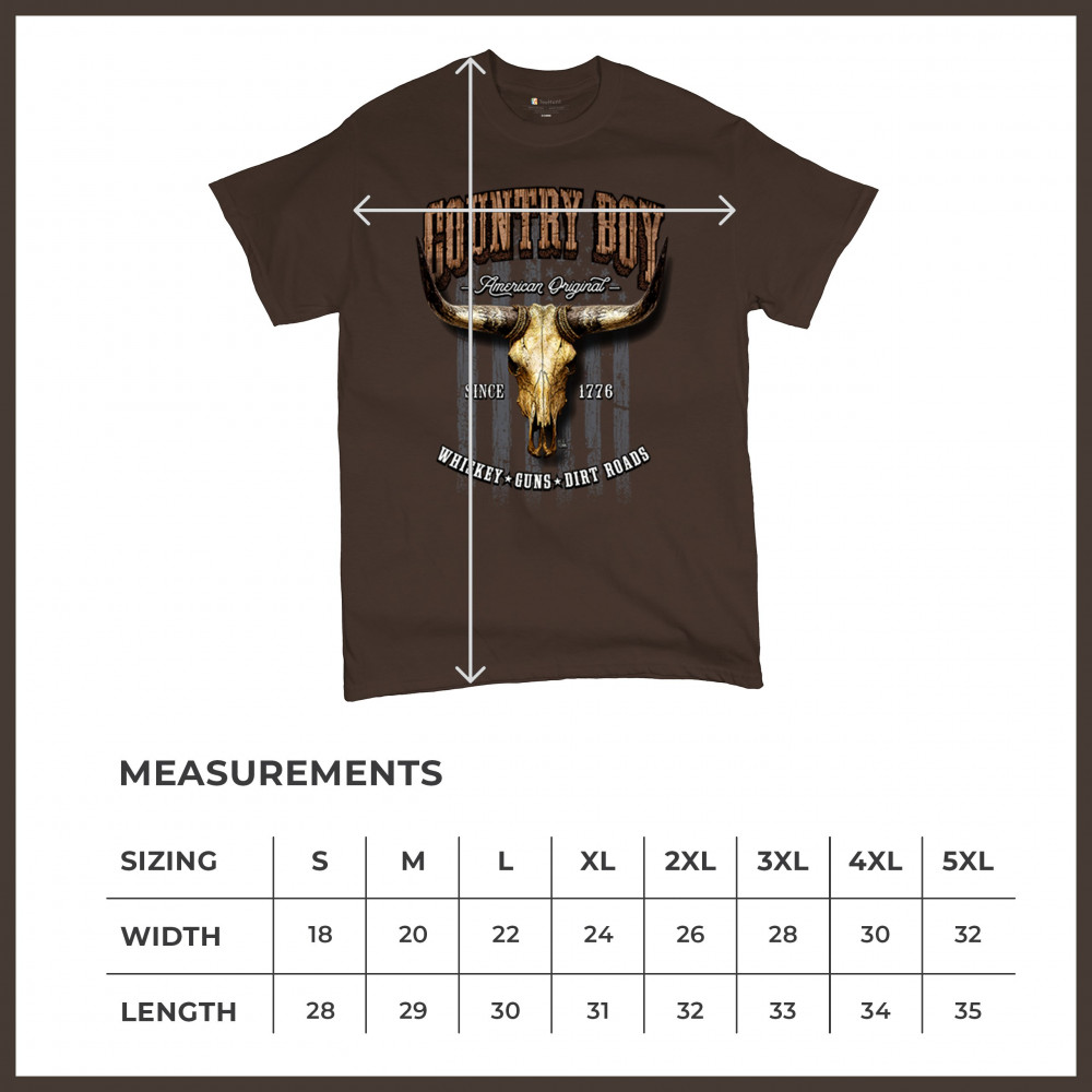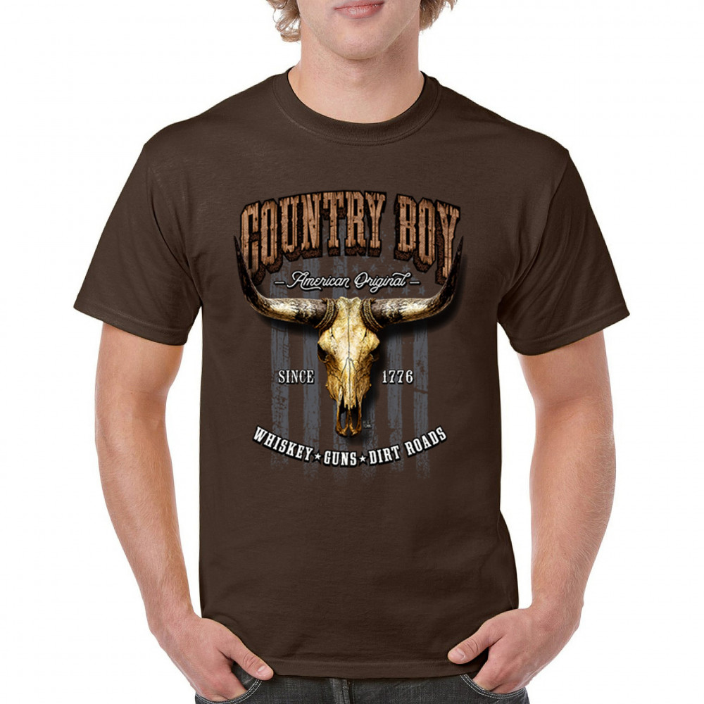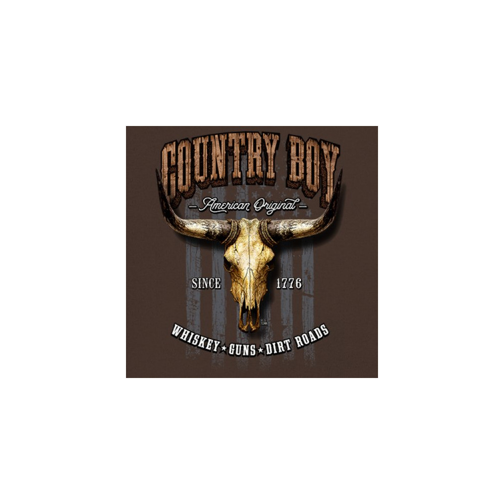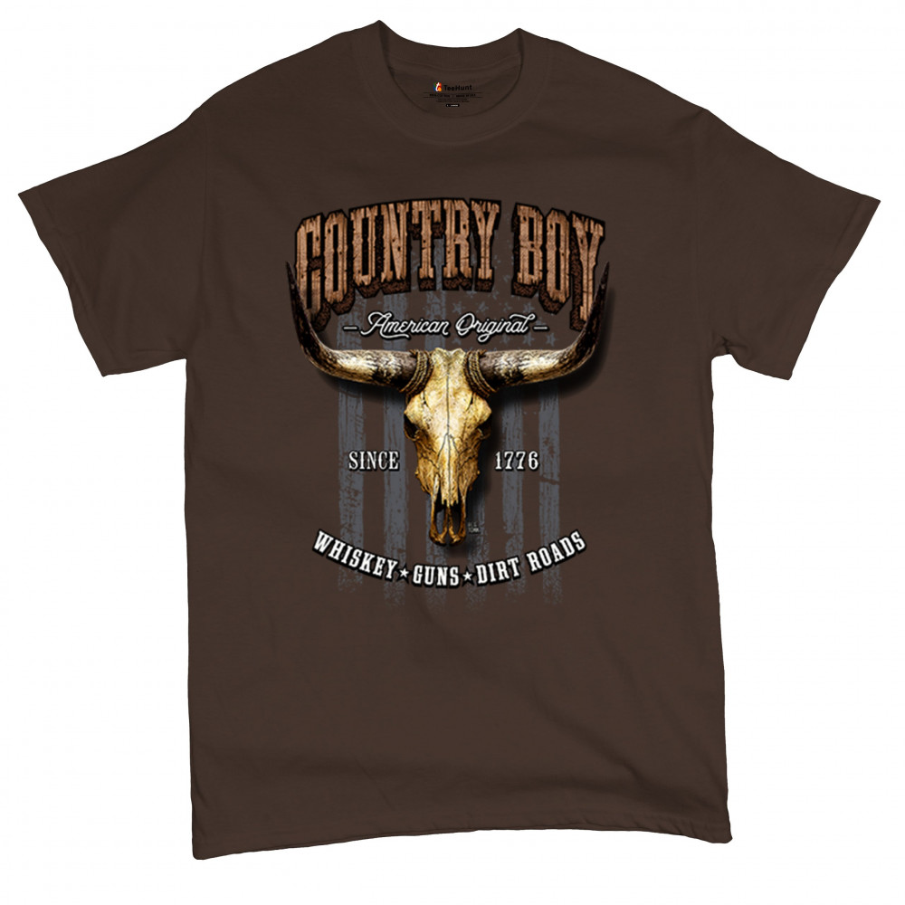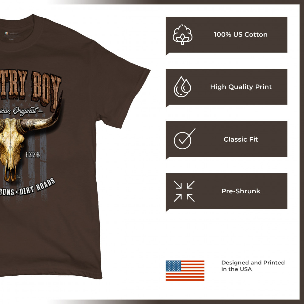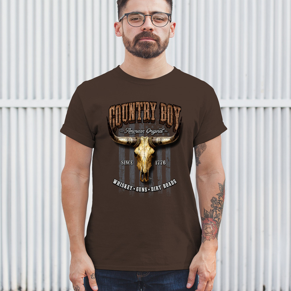 Country Boy – American Original. This bold western design captures the essence of southern living with a vintage bull skull, rustic lettering, and pride in whiskey, guns, and dirt roads. From 1776 to today, it honors the heritage of freedom-loving country men. Wear it to rodeos, bonfires, or muddy trails.