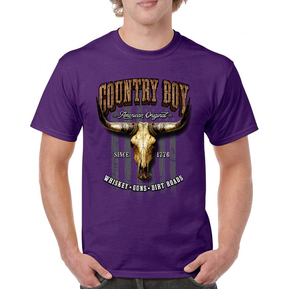 Country Boy – American Original. This bold western design captures the essence of southern living with a vintage bull skull, rustic lettering, and pride in whiskey, guns, and dirt roads. From 1776 to today, it honors the heritage of freedom-loving country men. Wear it to rodeos, bonfires, or muddy trails.
