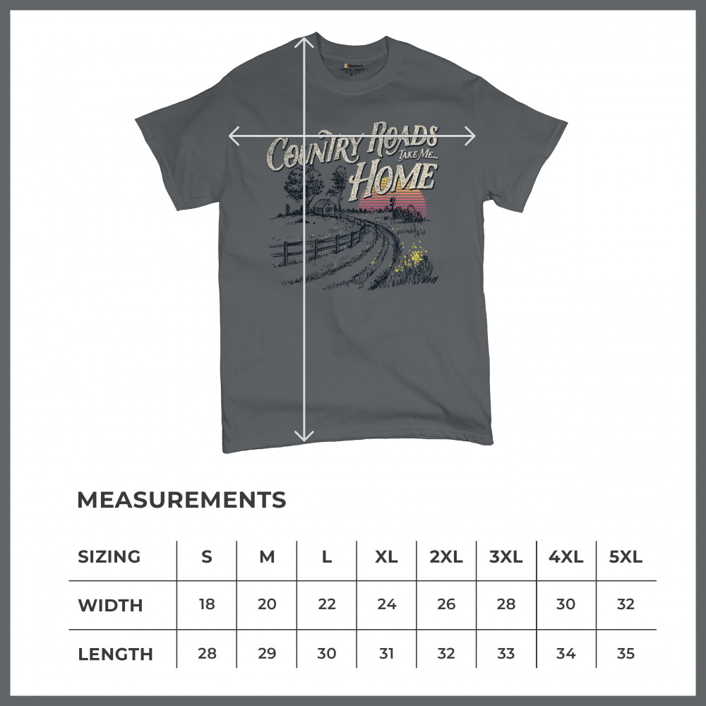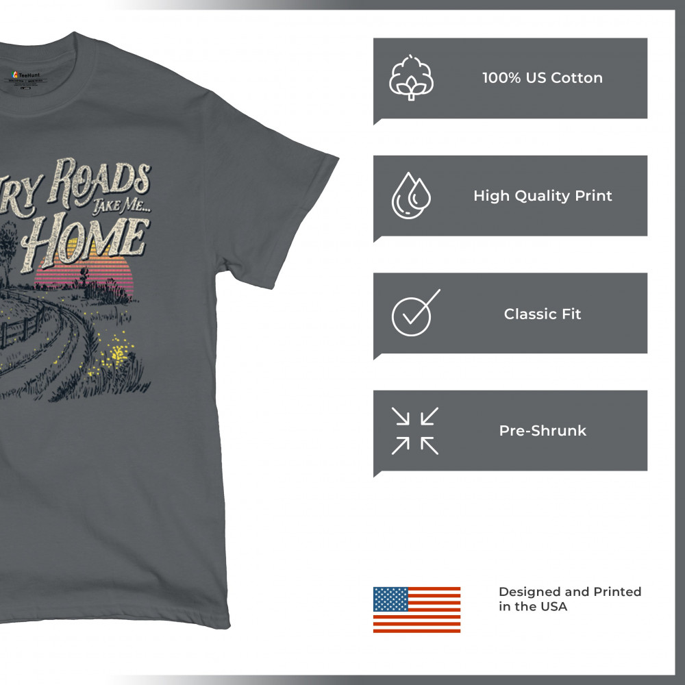 Celebrate your love for small town charm and scenic drives with this nostalgic country roads design. Featuring a bold "Take Me Home" message over a retro-styled sunset, it’s ideal for road trips, summer nights, fairs, concerts, and rural adventures. Let your wanderlust and country soul shine in every mile.
