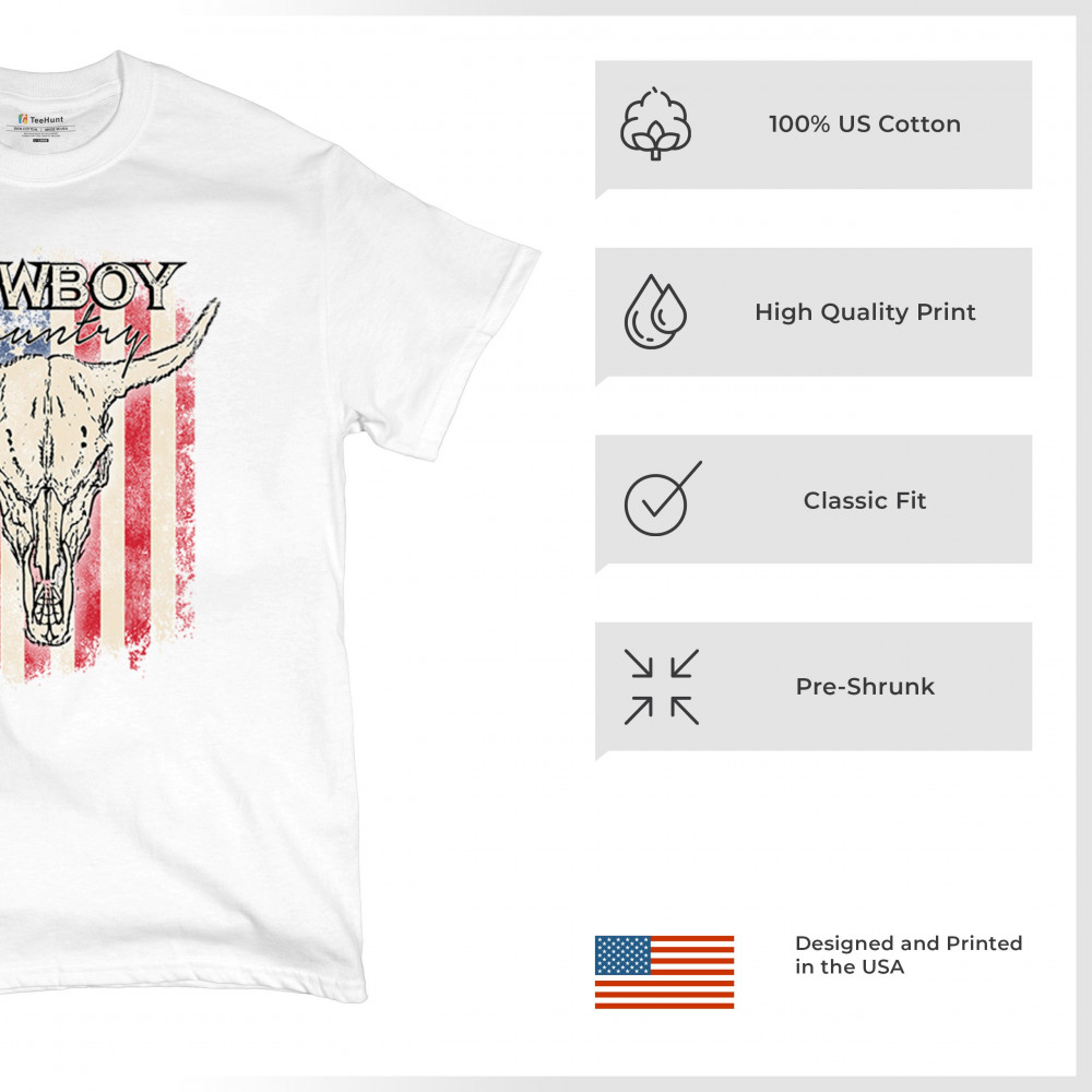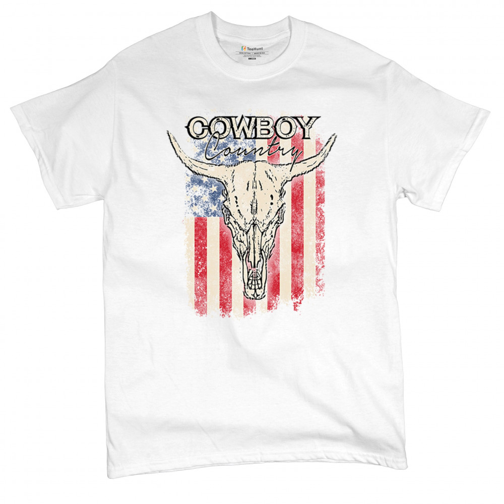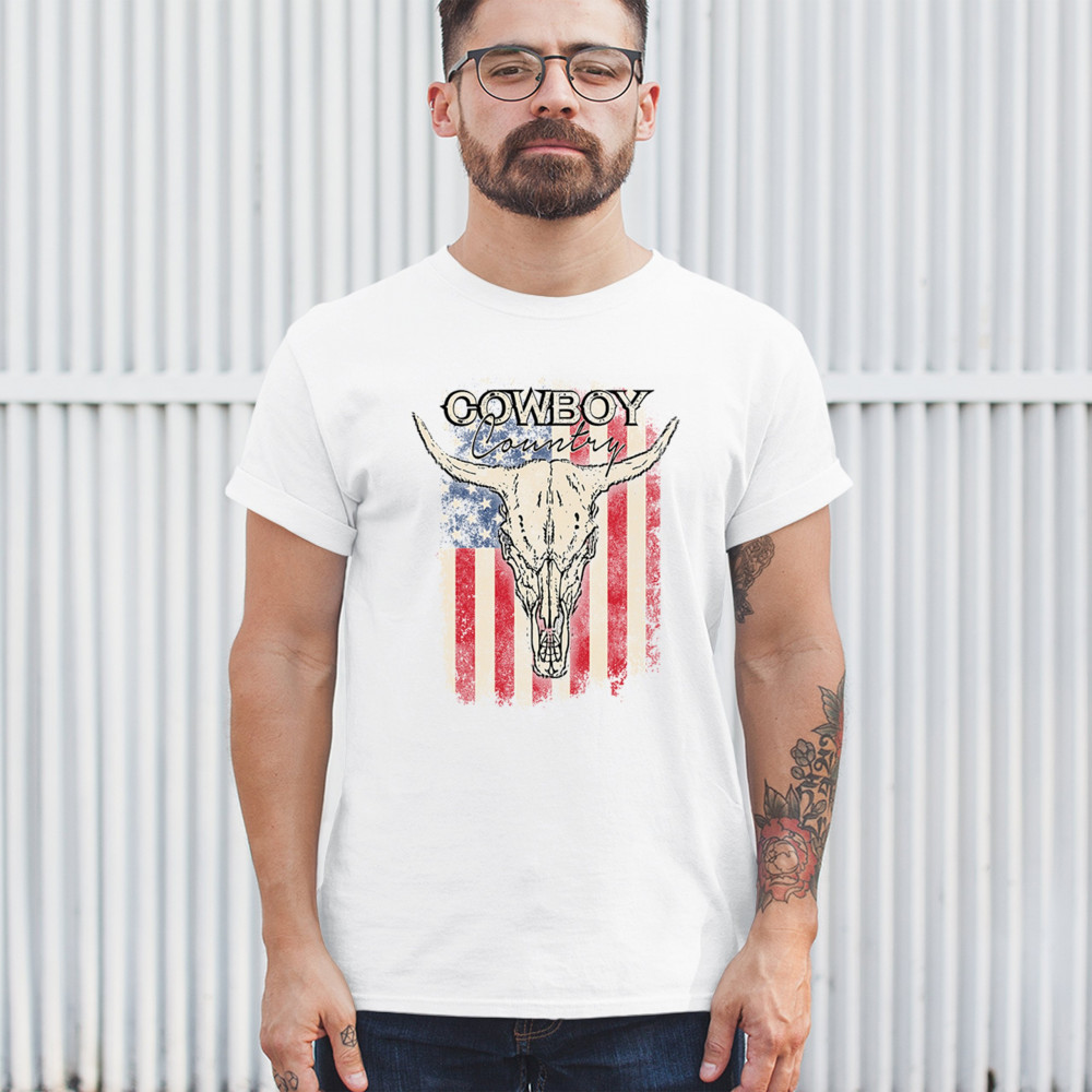 Celebrate western heritage with the Cowboy Country steer skull design, layered over a distressed American flag. This artwork embodies rustic Americana, rodeo style, and desert vibes. Perfect for cowboy décor lovers, ranch life enthusiasts, and those drawn to the wild west’s grit and prairie aesthetic. Wear your frontier spirit proudly.