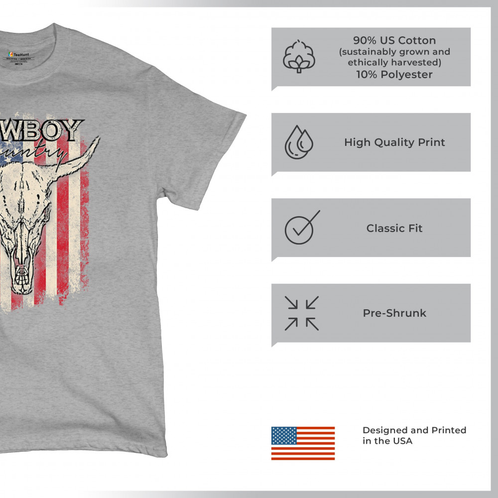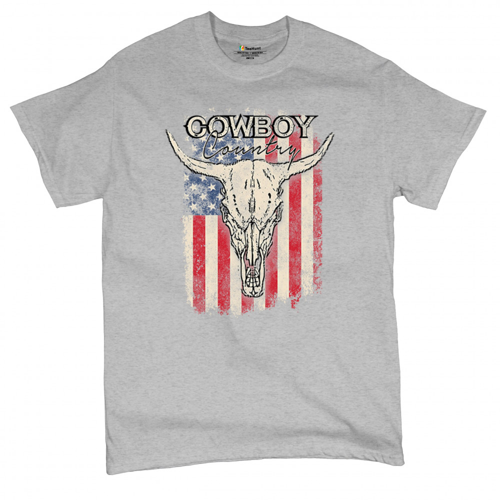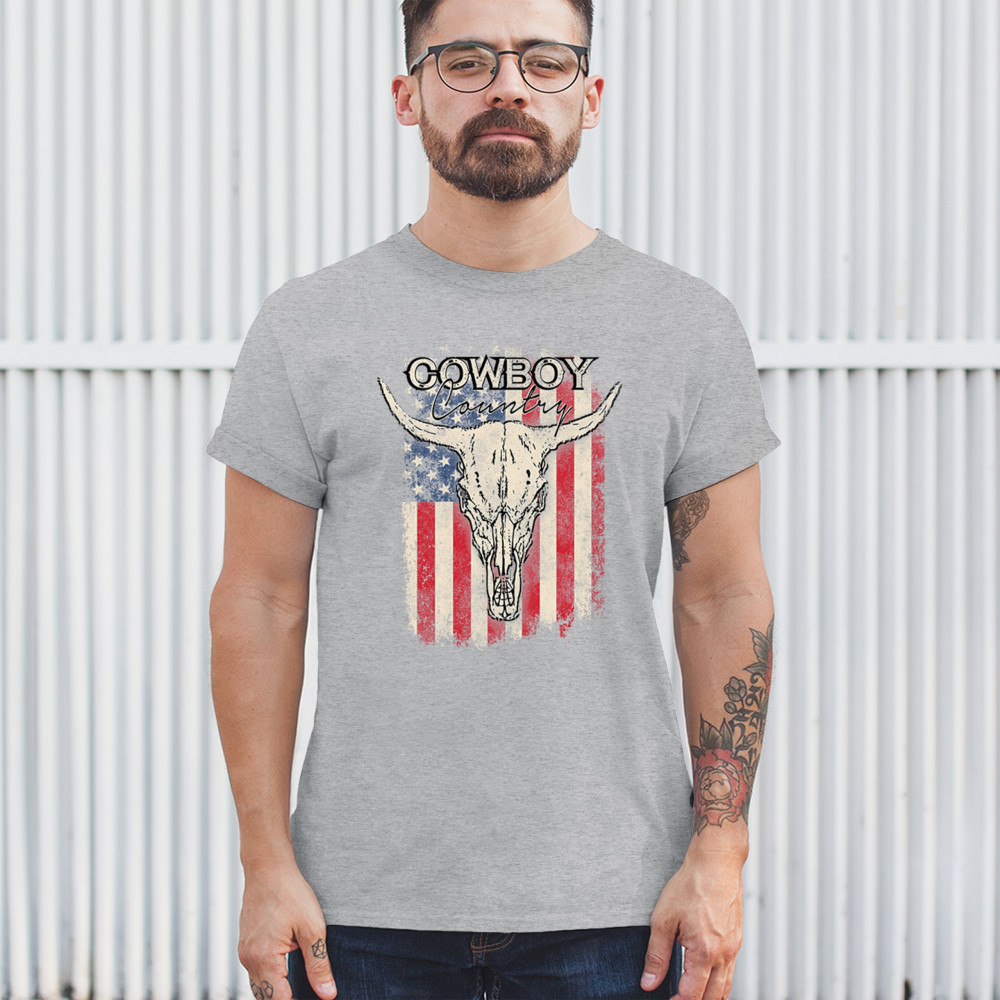 Celebrate western heritage with the Cowboy Country steer skull design, layered over a distressed American flag. This artwork embodies rustic Americana, rodeo style, and desert vibes. Perfect for cowboy décor lovers, ranch life enthusiasts, and those drawn to the wild west’s grit and prairie aesthetic. Wear your frontier spirit proudly.