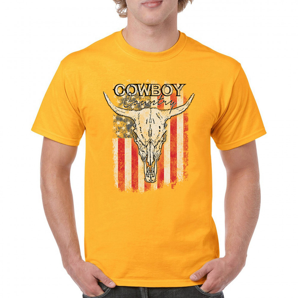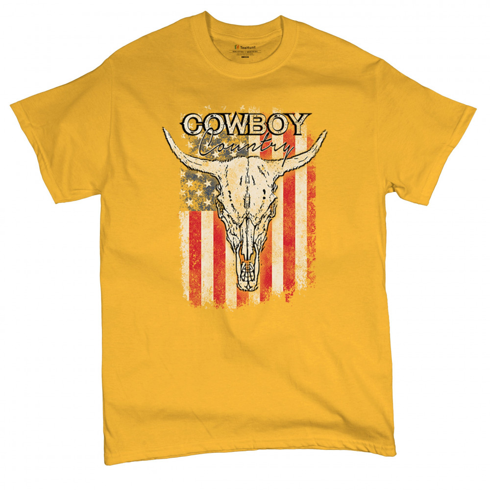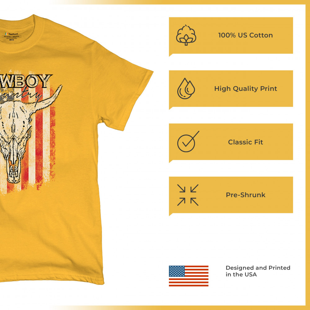 Cowboy Country steer skull design fuses rustic Americana, rodeo style, western heritage, and desert vibes for true frontier spirit.