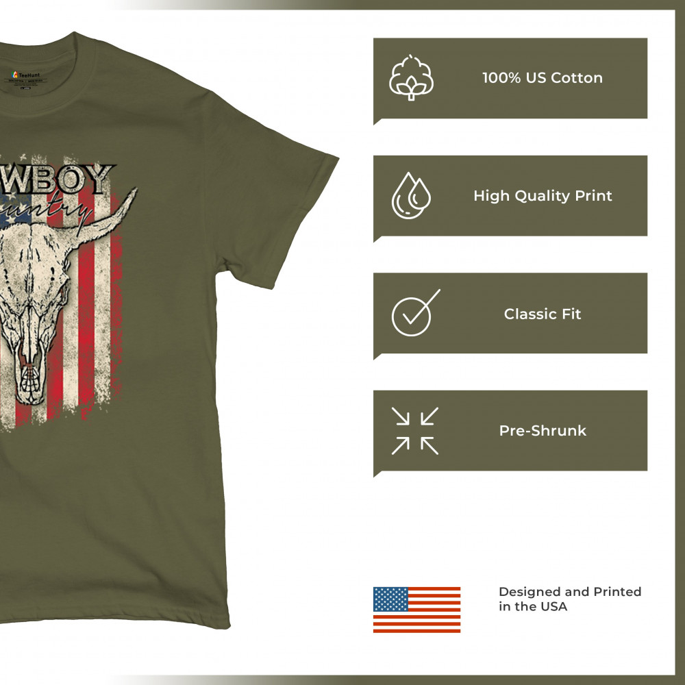 Celebrate western heritage with the Cowboy Country steer skull design, layered over a distressed American flag. This artwork embodies rustic Americana, rodeo style, and desert vibes. Perfect for cowboy décor lovers, ranch life enthusiasts, and those drawn to the wild west’s grit and prairie aesthetic. Wear your frontier spirit proudly.