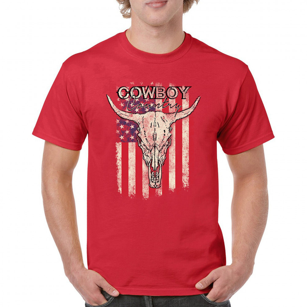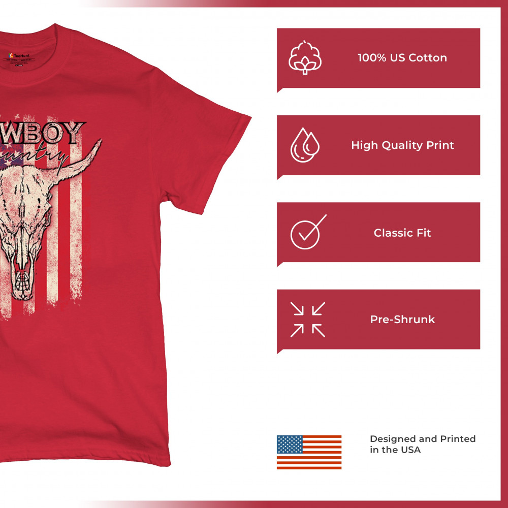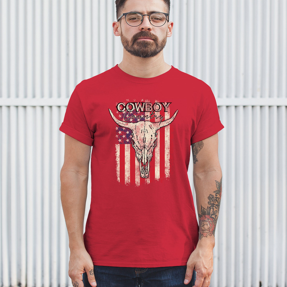Celebrate western heritage with the Cowboy Country steer skull design, layered over a distressed American flag. This artwork embodies rustic Americana, rodeo style, and desert vibes. Perfect for cowboy décor lovers, ranch life enthusiasts, and those drawn to the wild west’s grit and prairie aesthetic. Wear your frontier spirit proudly.
