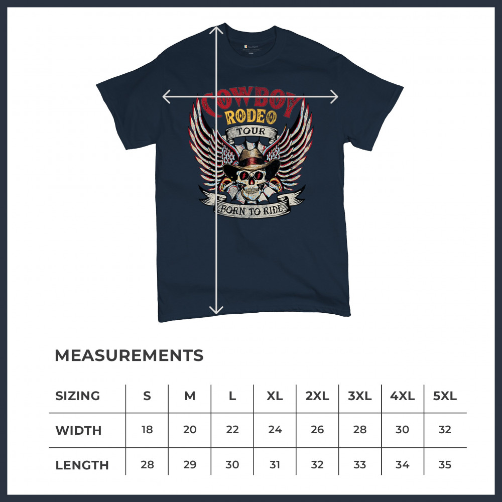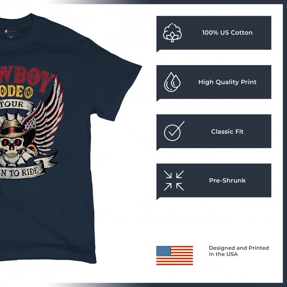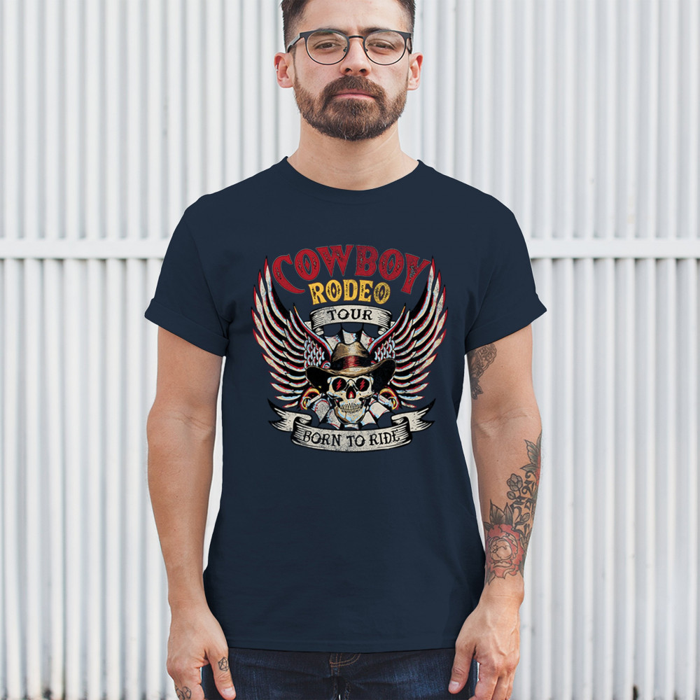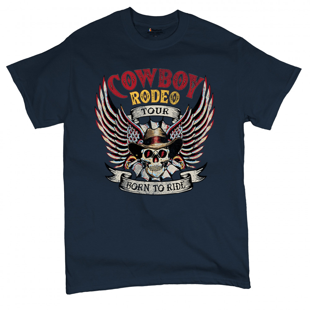 Cowboy Rodeo Tour “Born to Ride†design with skull, wings, and western grit. Built for riders, rebels, and rodeo fans who live wild.