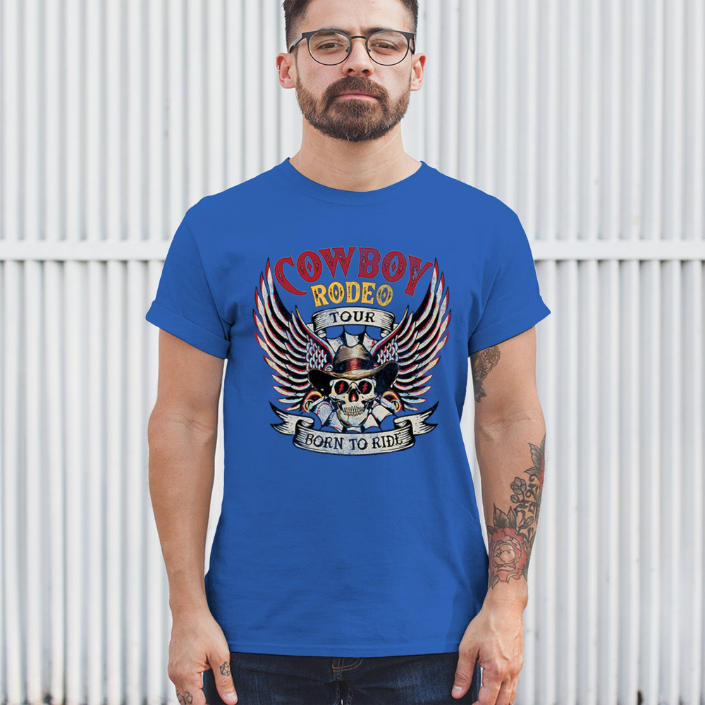 Cowboy Rodeo Tour “Born to Ride†design with skull, wings, and western grit. Built for riders, rebels, and rodeo fans who live wild.