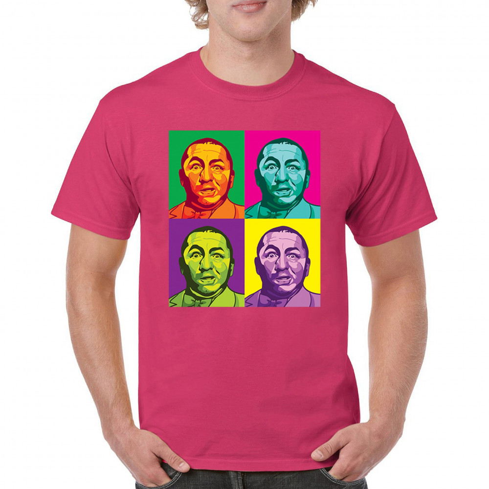 Introducing our dazzling pop art collection, headlined by the inimitable Curly of the Three Stooges! With a quartet of vivid hues, this T-shirt is a contemporary twist on classic humor. It's a standout piece for any fan's collection, capturing the timeless expression of Curly in a modern art style that's sure to turn heads and spark smiles.
