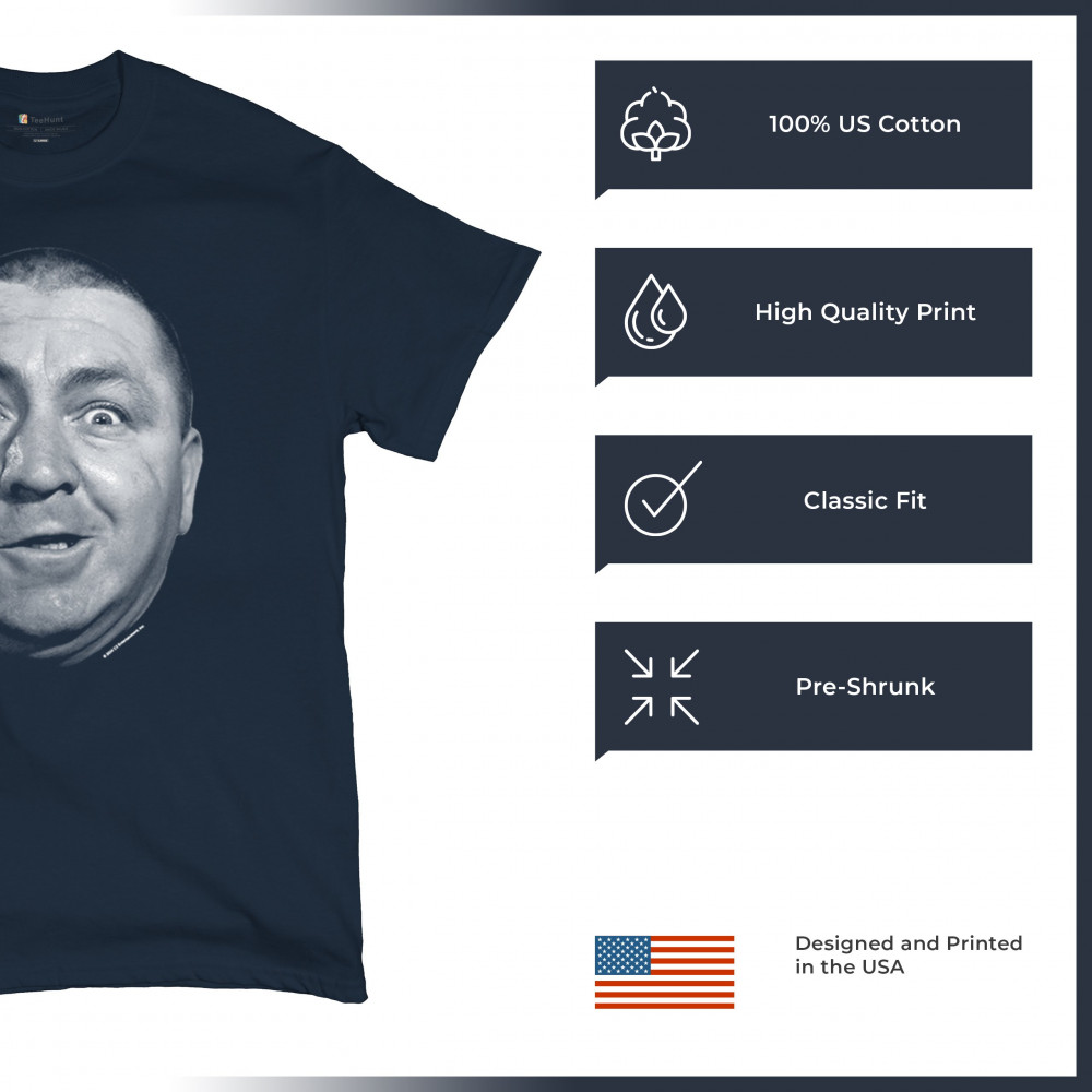 This bold Curly design from the Three Stooges is a monochromatic masterpiece, immortalizing his bewildered expression in high-contrast black and white. Perfect for classic comedy enthusiasts, this piece brings a dose of Curly's unforgettable face to your daily life. It's a conversation starter, a statement of humor, and a loving nod to the golden age of film comedy, capturing the essence of the Stooges' slapstick legacy in every detail.