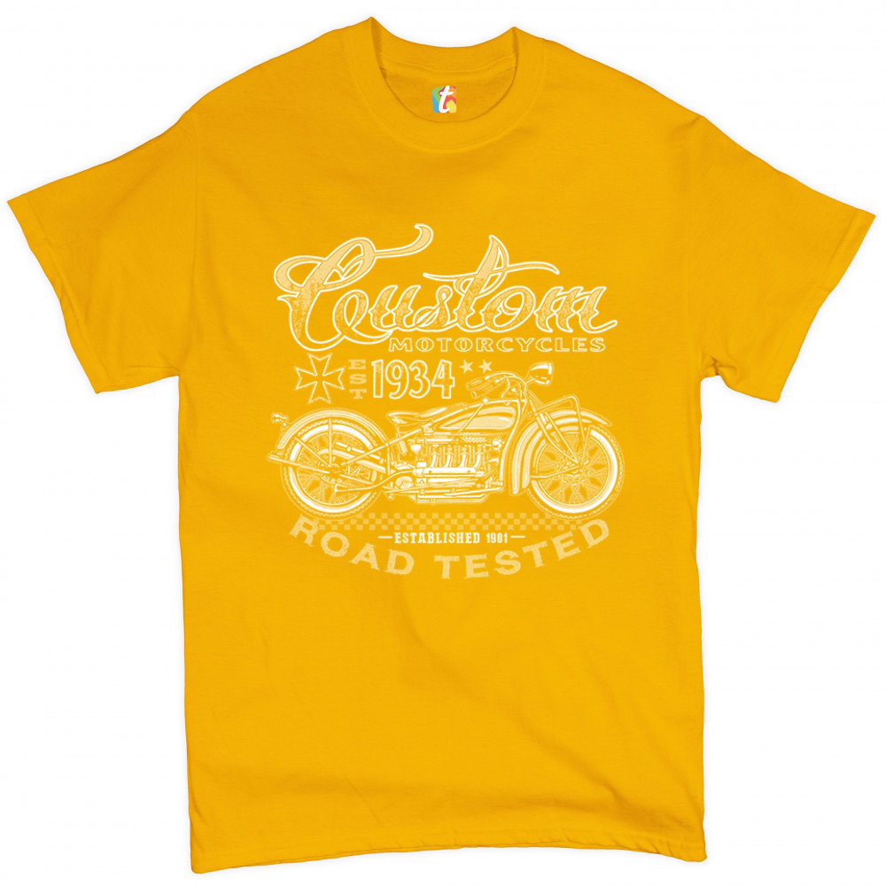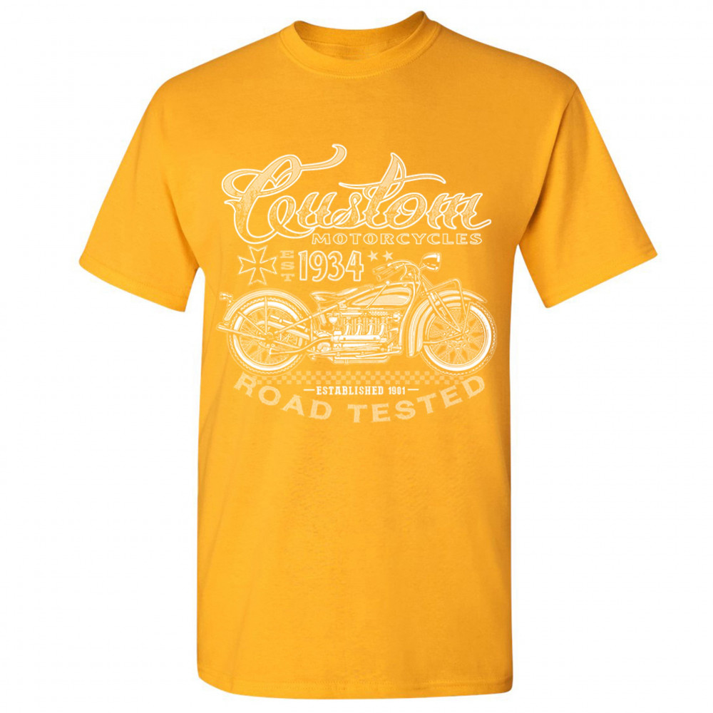 CUSTOM MOTORCYCLES ROAD TESTED t-shirt bobber biker gang mc men's tee yellow