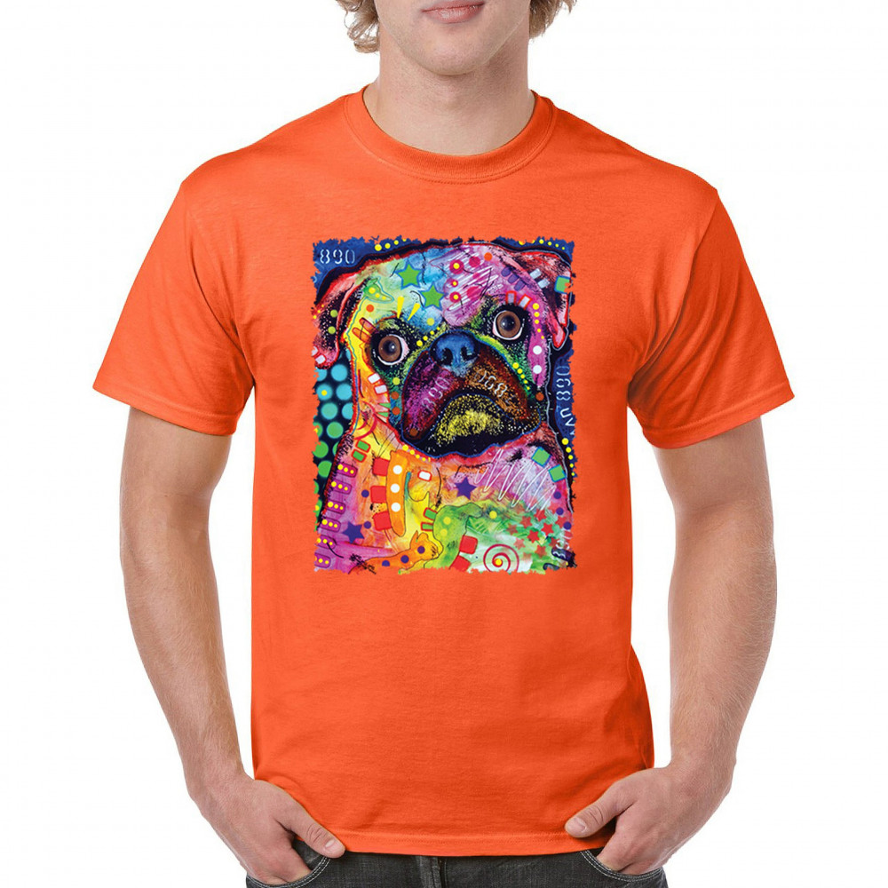 CUTE PUG PUPPY t-shirt dean russo colorful neon mosaic dog art men's tee orange