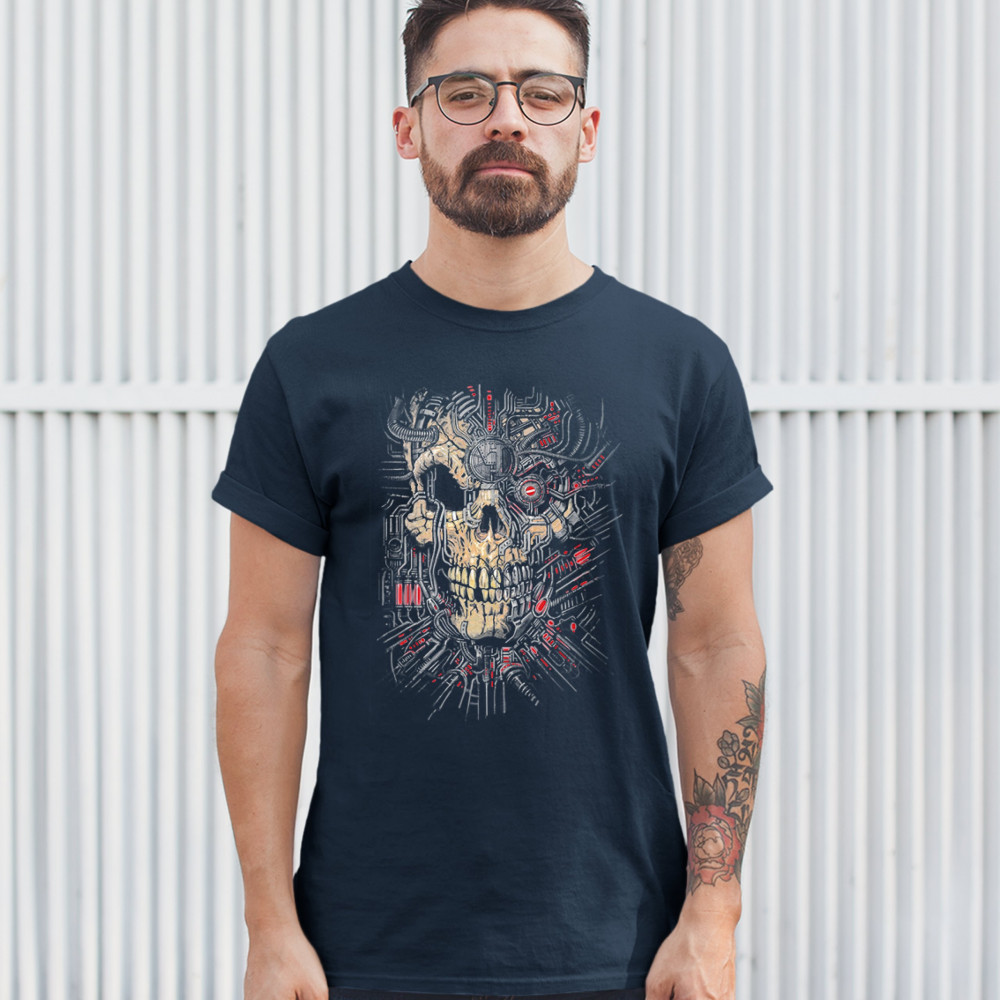 A huge print featuring a scary cybernetic skull with a prosthetic eye and surrounded by tubes and wires. A great choice for a person who is into horror movies, sci-fi comic books and nightmare-inducing stories!